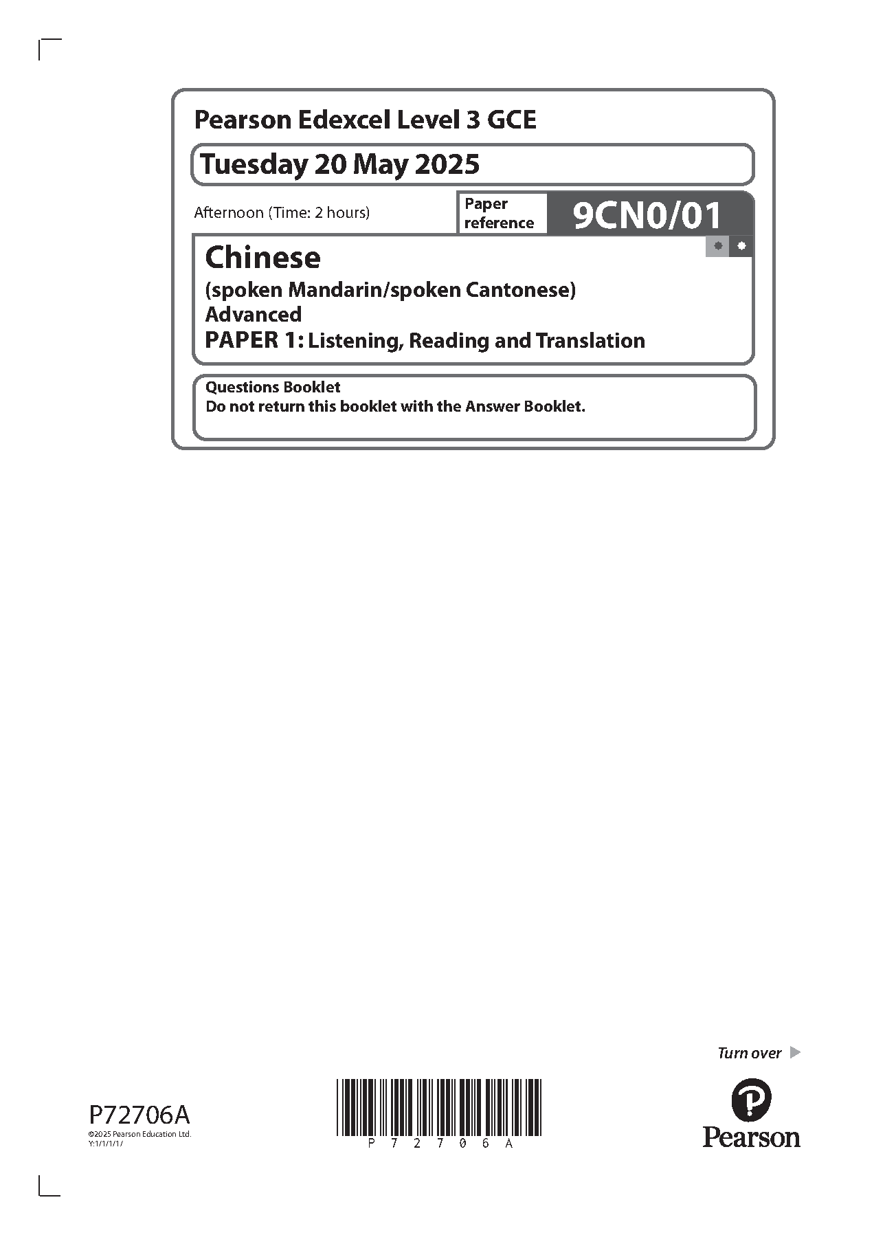 MERGED 2025 Pearson Edexcel A Level Chinese PAPER 1 and Mark Scheme (9CN0/01: Listening, Reading and Translation)