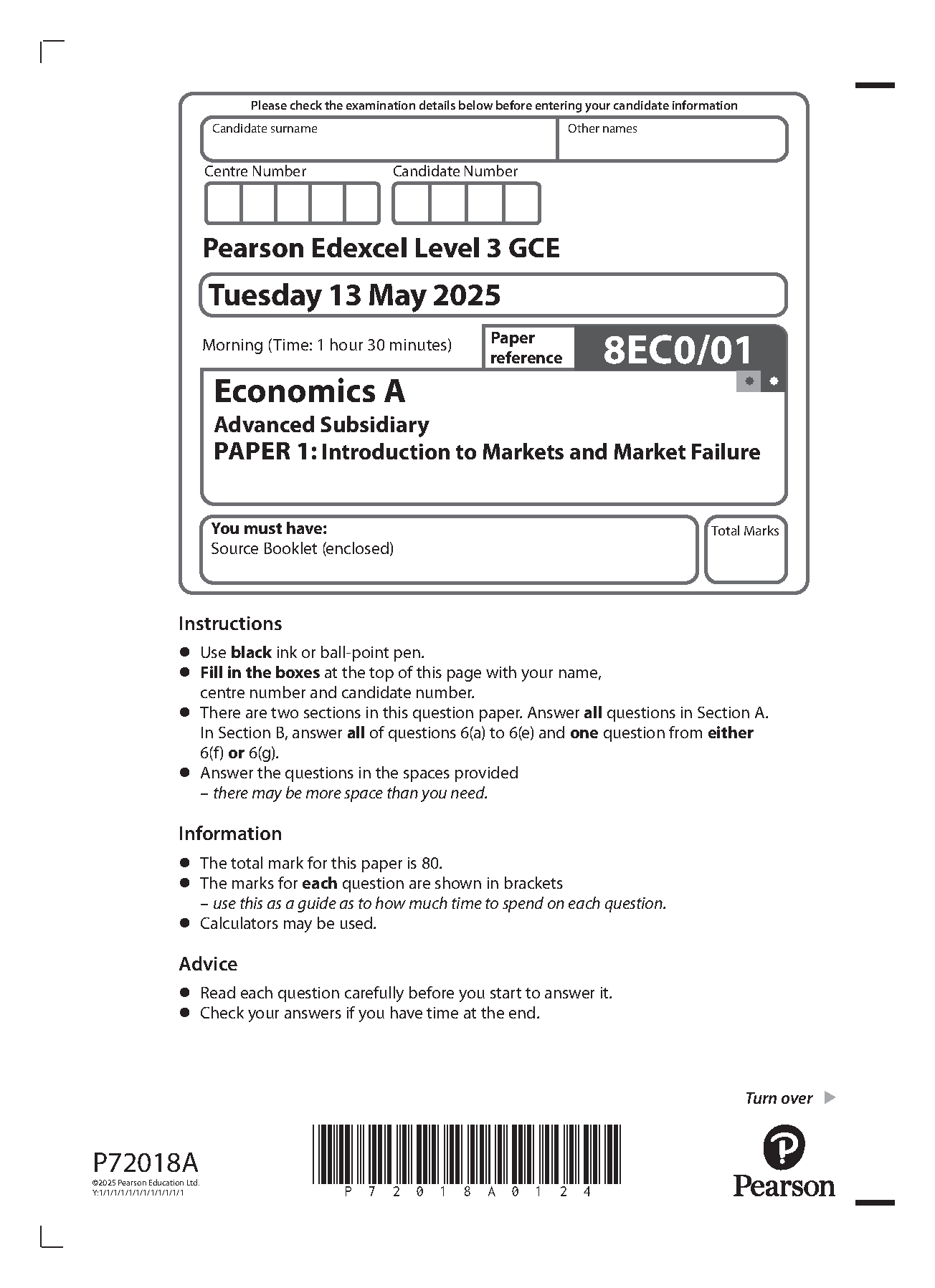 MERGED 2025 Pearson Edexcel AS Level Economics A PAPER 1 and Mark Scheme (8EC0/01: Introduction to Markets and Market Failure)