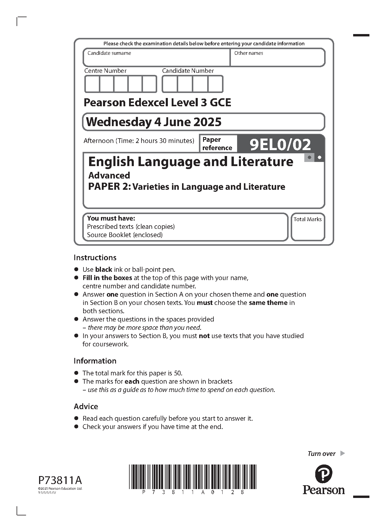 MERGED 2025 Pearson Edexcel A Level English Language and Literature Paper 2 and Mark Scheme (9EL0/02: Varieties in Language and Literature)