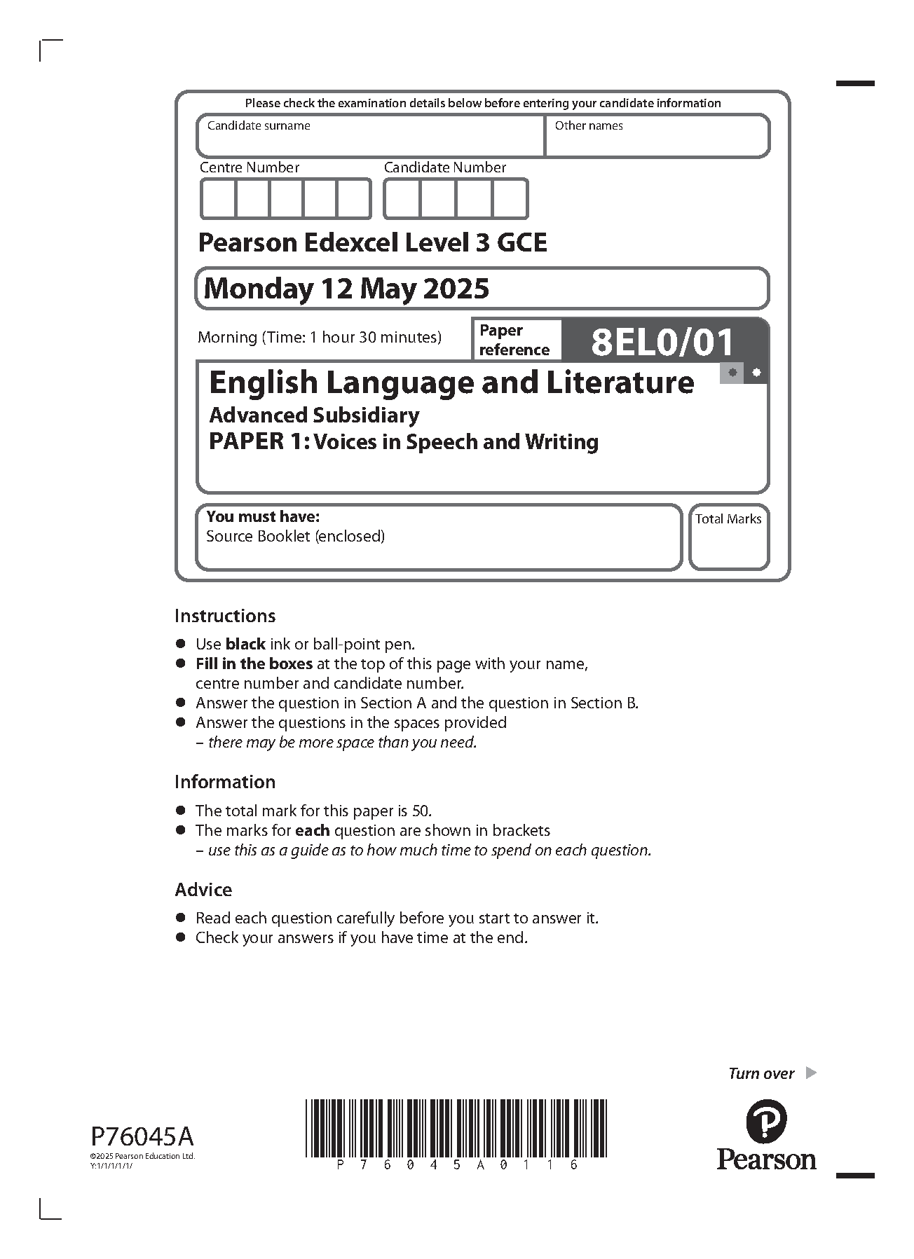 MERGED 2025 Pearson Edexcel AS Level English Language and Literature Paper 1 and Mark Scheme (8EL0/01: Voices in Speech and Writing)