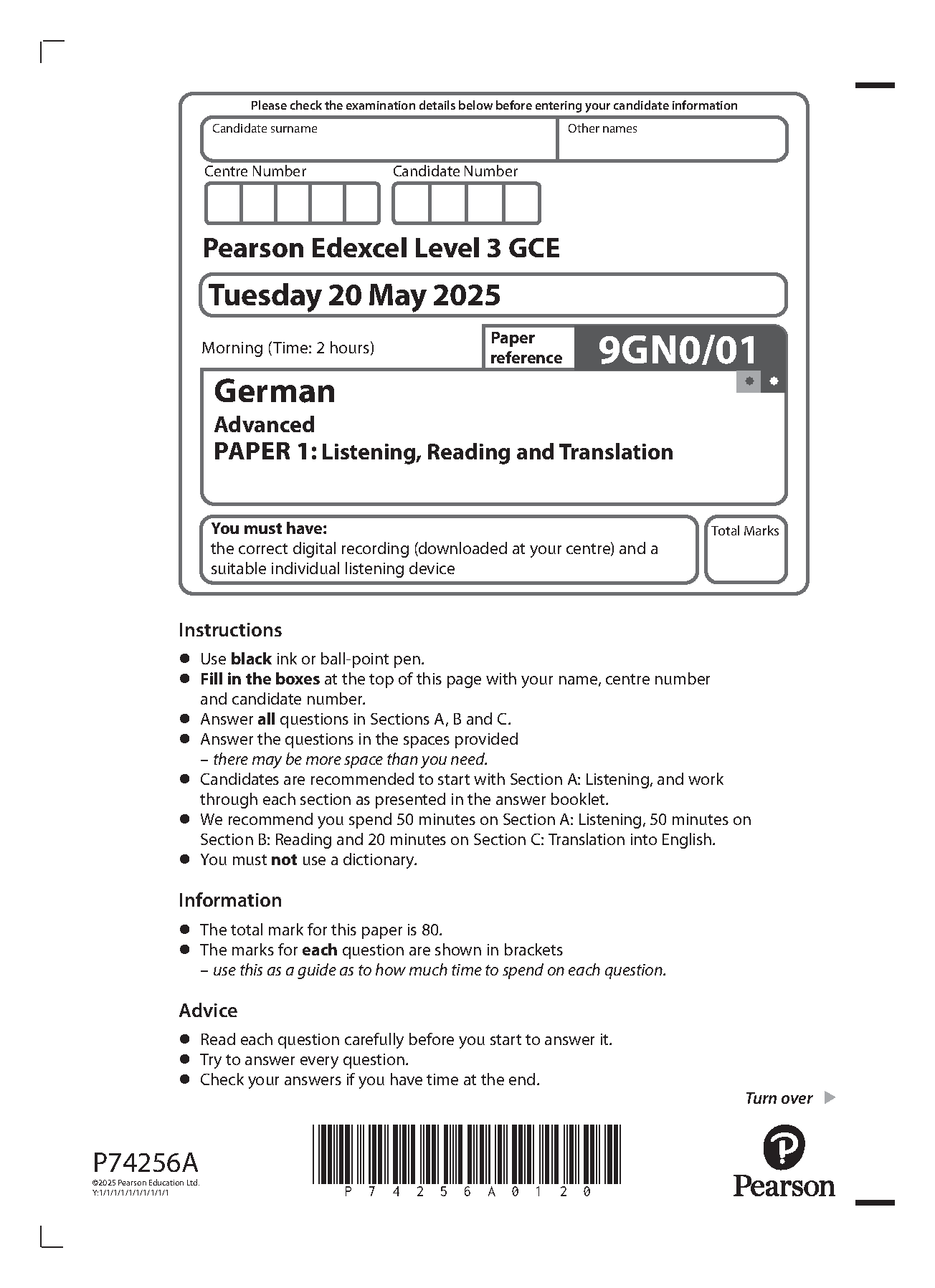 MERGED 2025 Pearson Edexcel A Level German Paper 1 and Mark Scheme (9GN0/01: Listening, Reading and Translation)