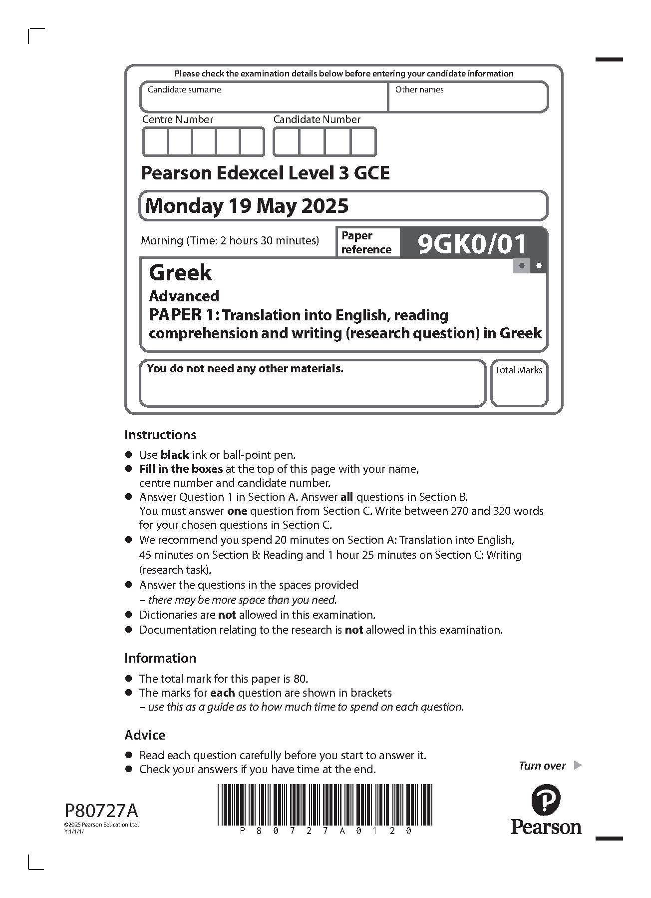 MERGED 2025 Pearson Edexcel A Level Greek Paper 1 and Mark Scheme (9GK0/01: Translation into English, reading comprehension and writing (research question) in Greek)