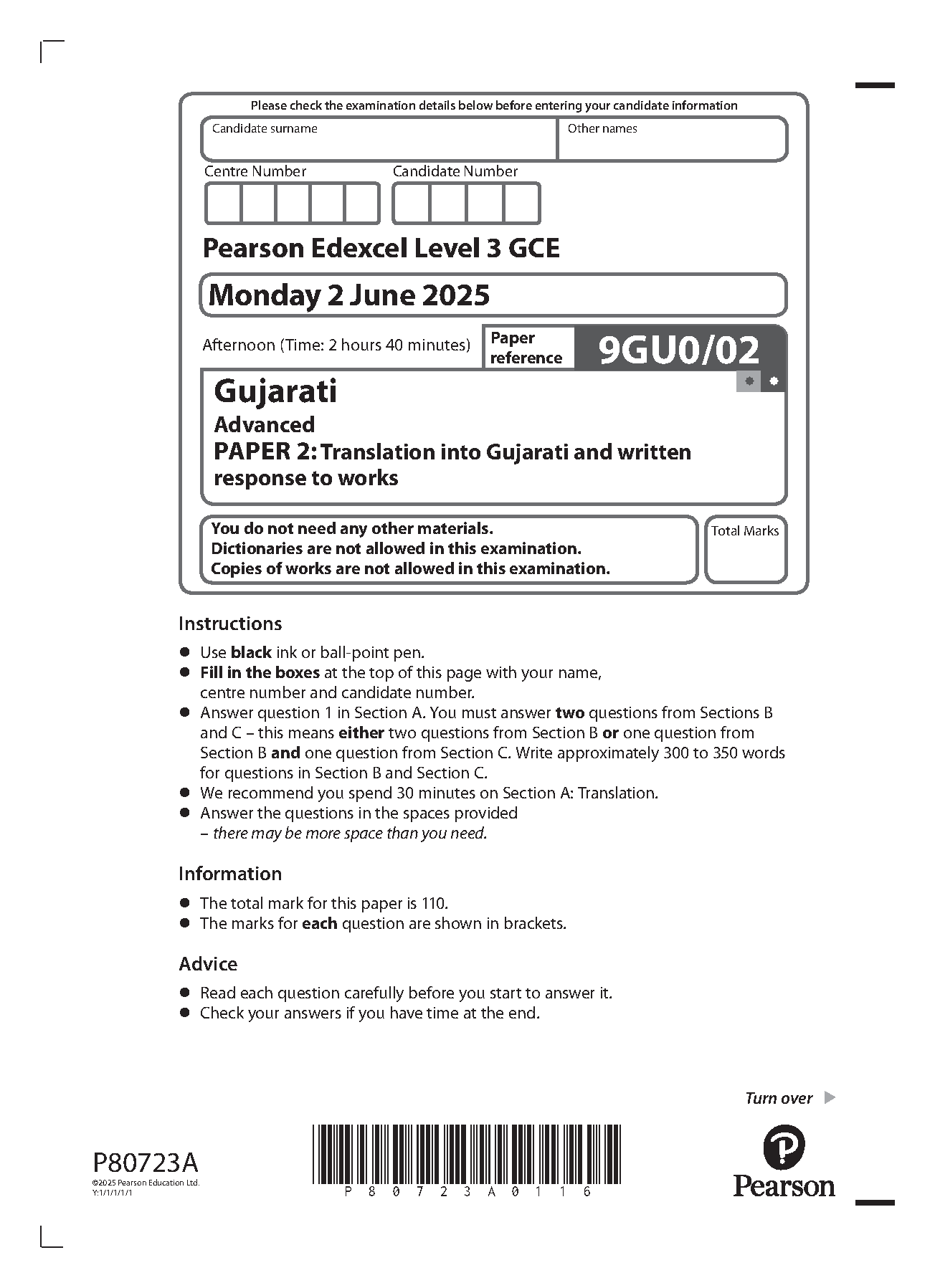 MERGED 2025 Pearson Edexcel A Level Gujarati Paper 2 and Mark Scheme (9GU0/02: Translation into Gujarati and written response to works)