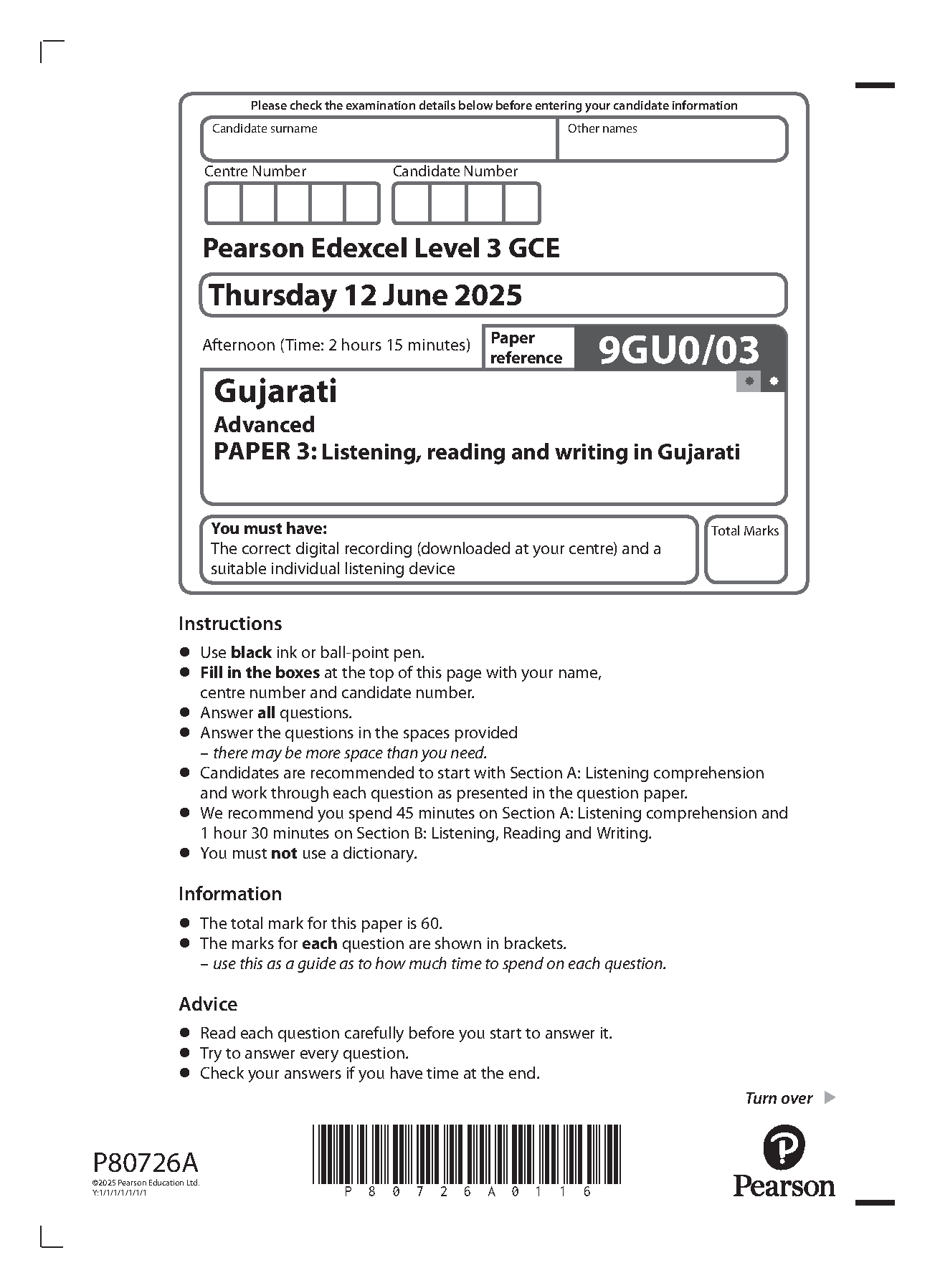MERGED 2025 Pearson Edexcel A Level Gujarati Paper 3 and Mark Scheme (9GU0/03: Listening, reading and writing in Gujarati)