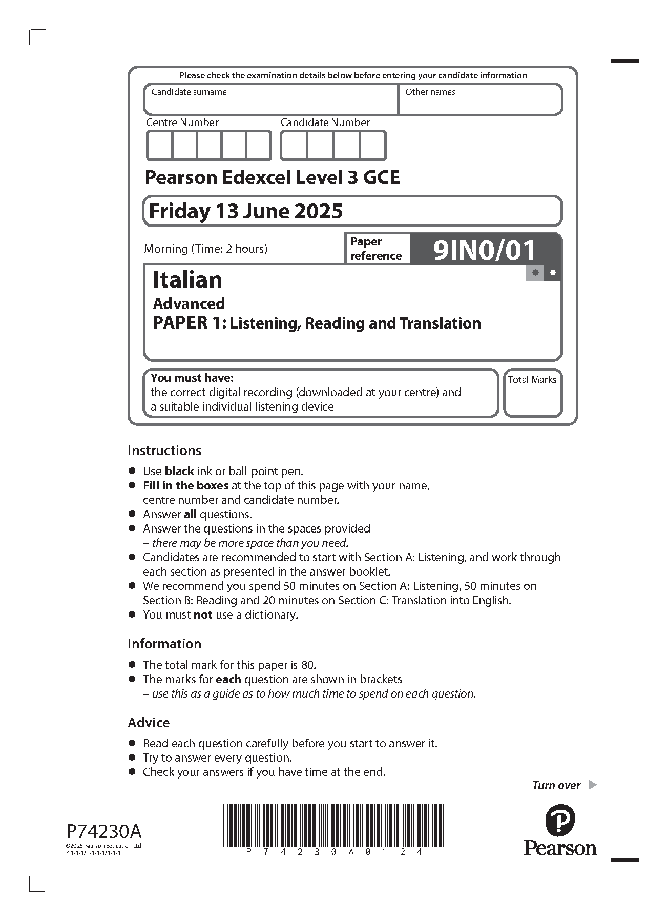 MERGED 2025 Pearson Edexcel A Level Italian Paper 1 and Mark Scheme (9IN0/01: Listening, Reading and Translation)