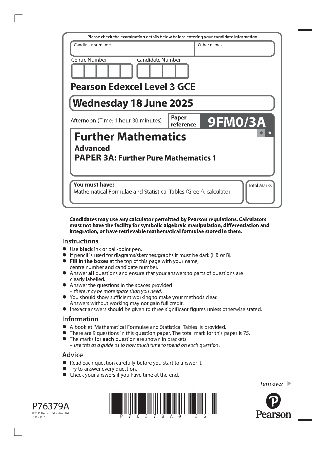 MERGED 2025 Pearson Edexcel A Level Further Mathematics PAPER 3A and Mark Scheme (9FM0/3A: Further Pure Mathematics 1)