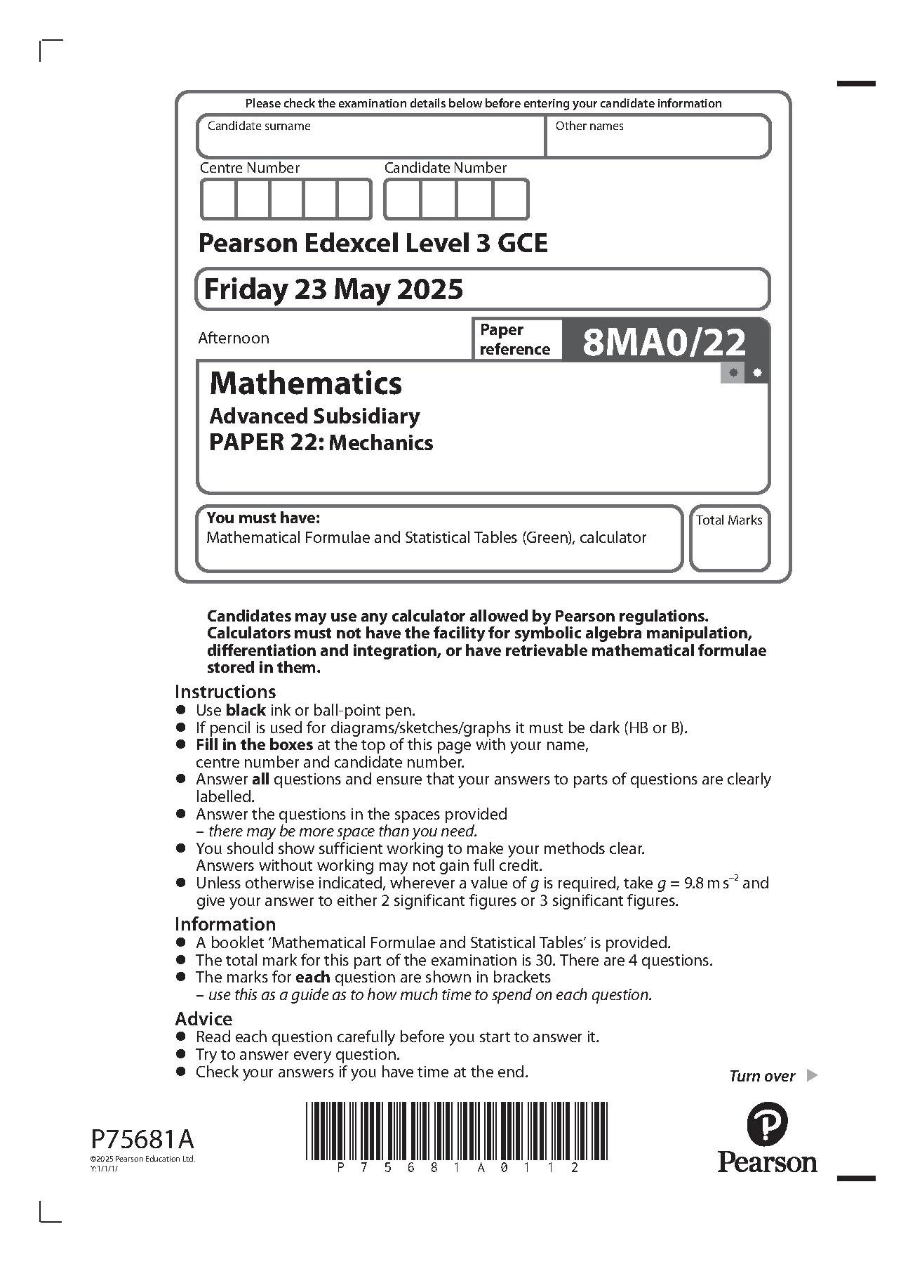 MERGED 2025 Pearson Edexcel AS Level Mathematics PAPER 22 and Mark Scheme (8MA0/22: Mechanics)