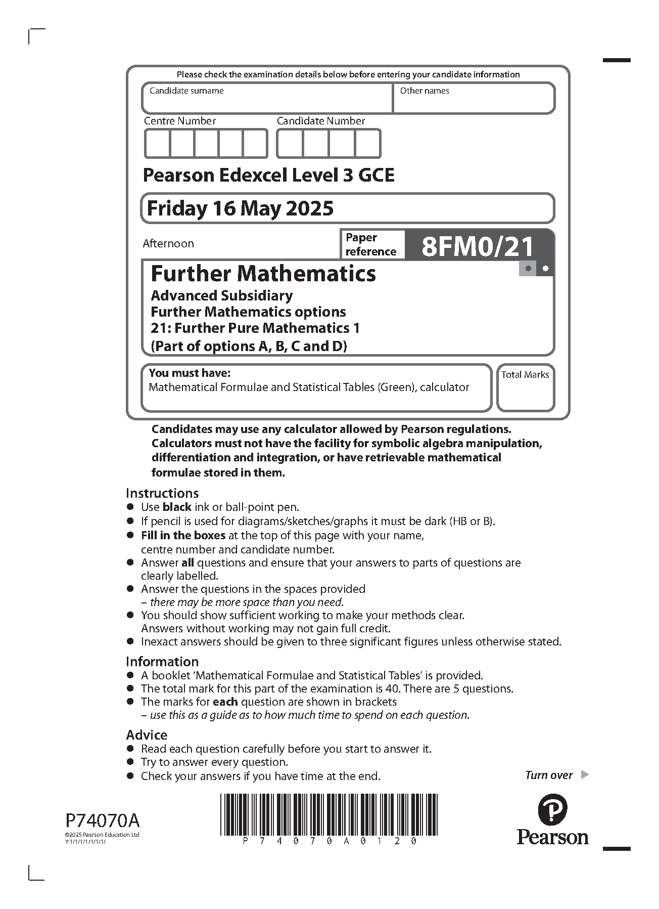 MERGED 2025 Pearson Edexcel AS Level Further Mathematics Paper 21 and Mark Scheme (8FM0/21: Further Pure Mathematics 1)