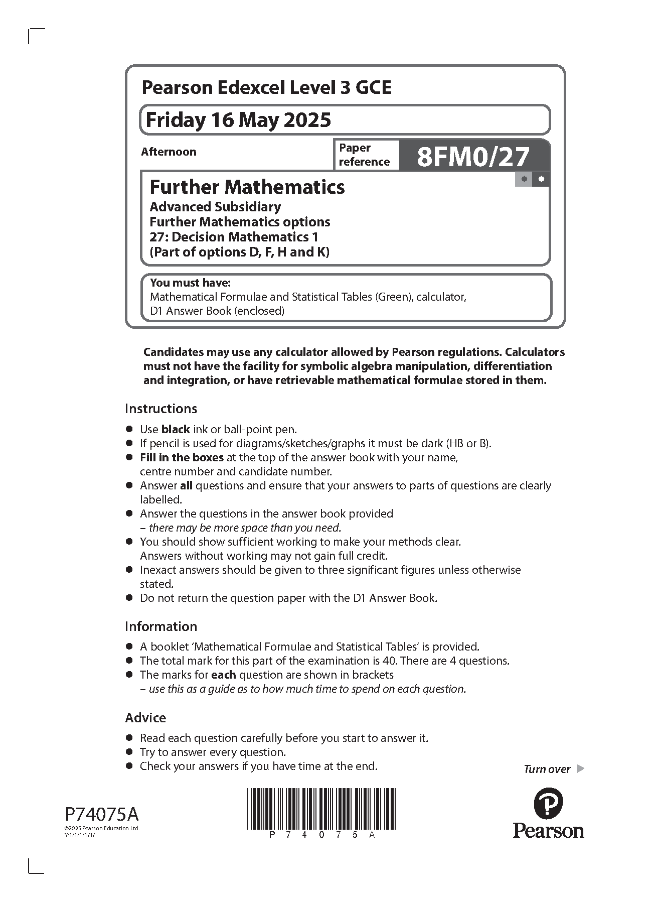 MERGED 2025 Pearson Edexcel AS Level Further Mathematics Paper 27 and Mark Scheme (8FM0/27: Decision Mathematics 1)