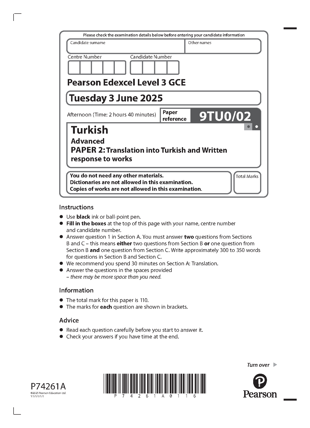 2025 Pearson Edexcel A Level Turkish PAPER 2 and Mark Scheme (9TU0/02: Translation into Turkish and Written response to works)