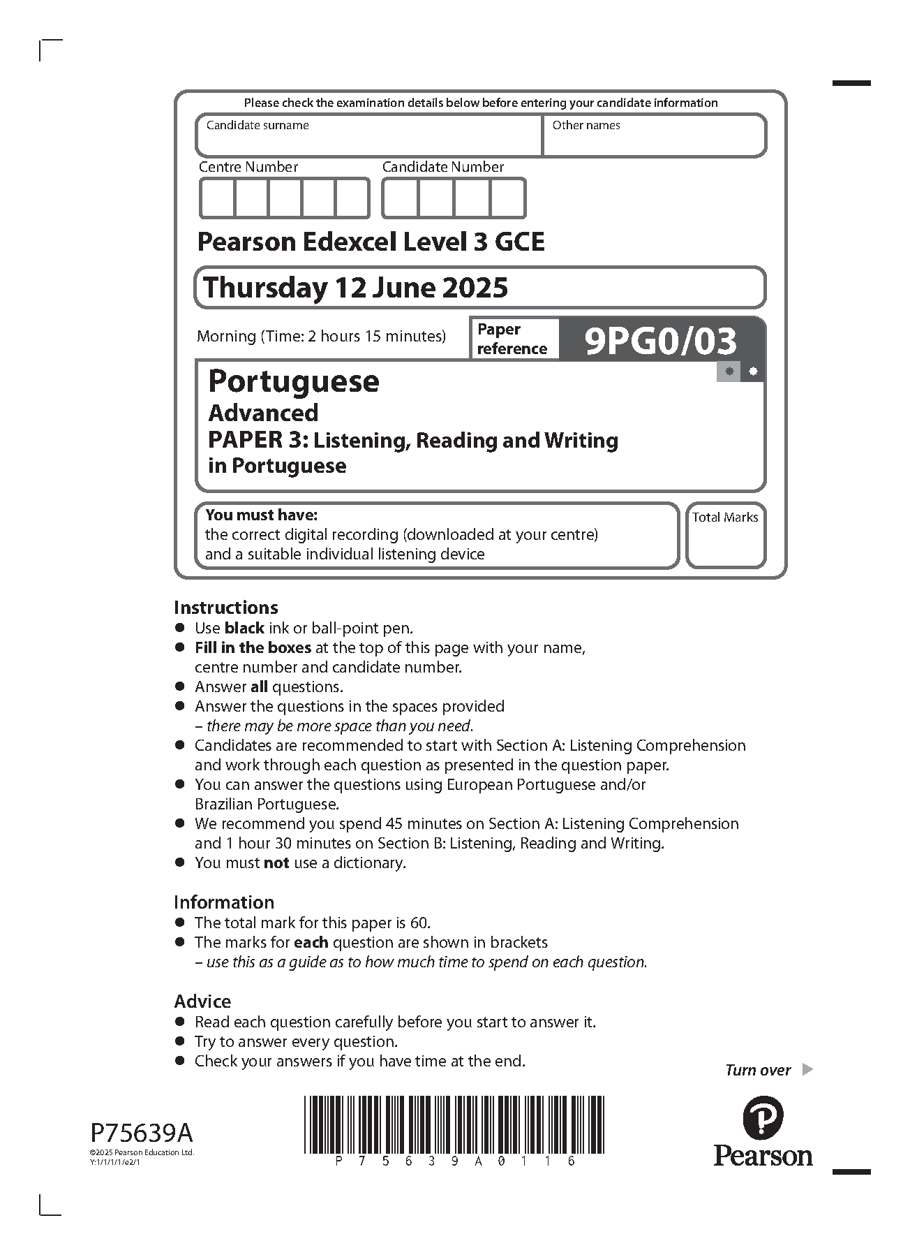 MERGED 2025 Pearson Edexcel A Level Portuguese PAPER 3 and Mark Scheme (9PG0/03: Listening, Reading and Writing in Portuguese)
