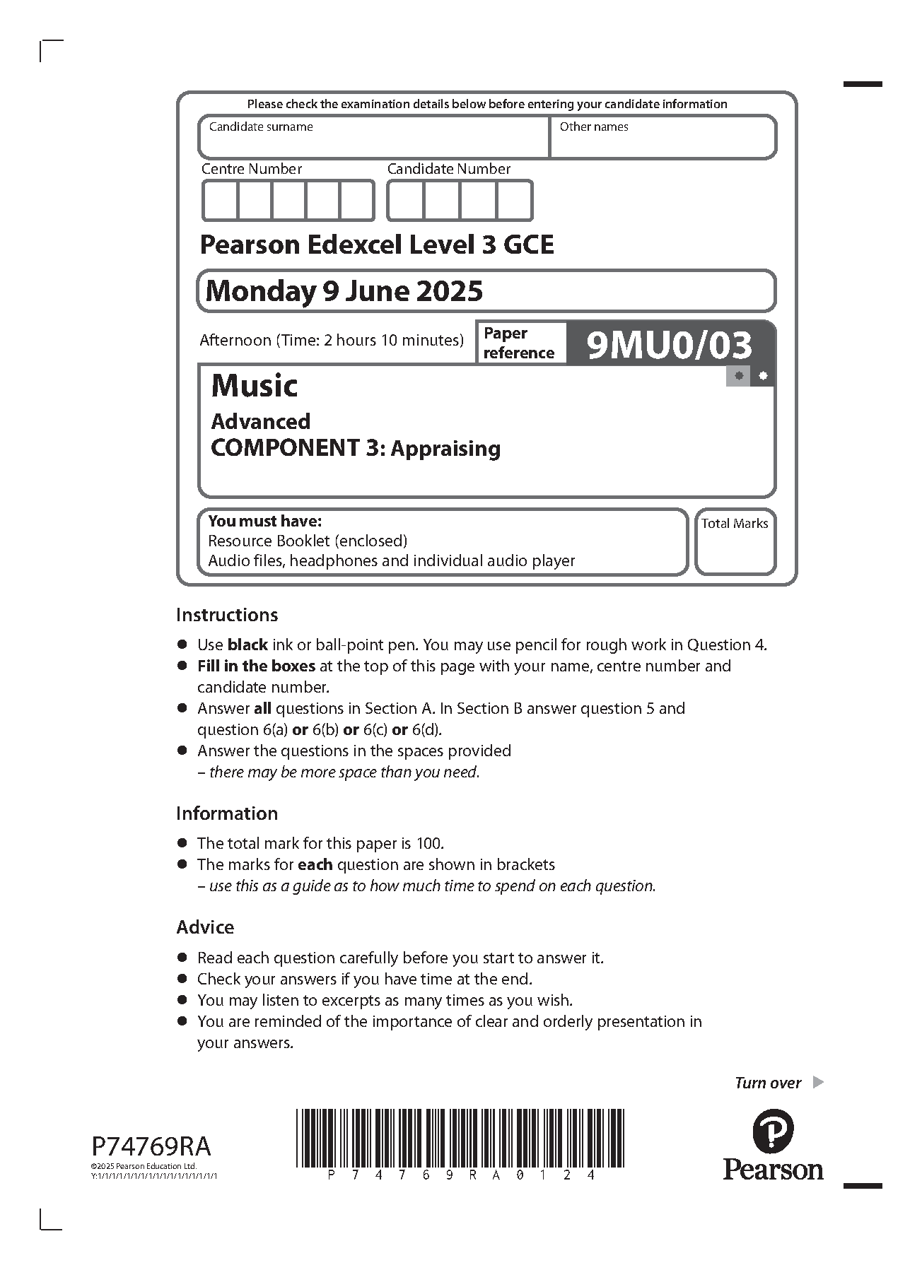 MERGED 2025 Pearson Edexcel A Level Music Paper 3 and Mark Scheme (9MU003 Appraising)