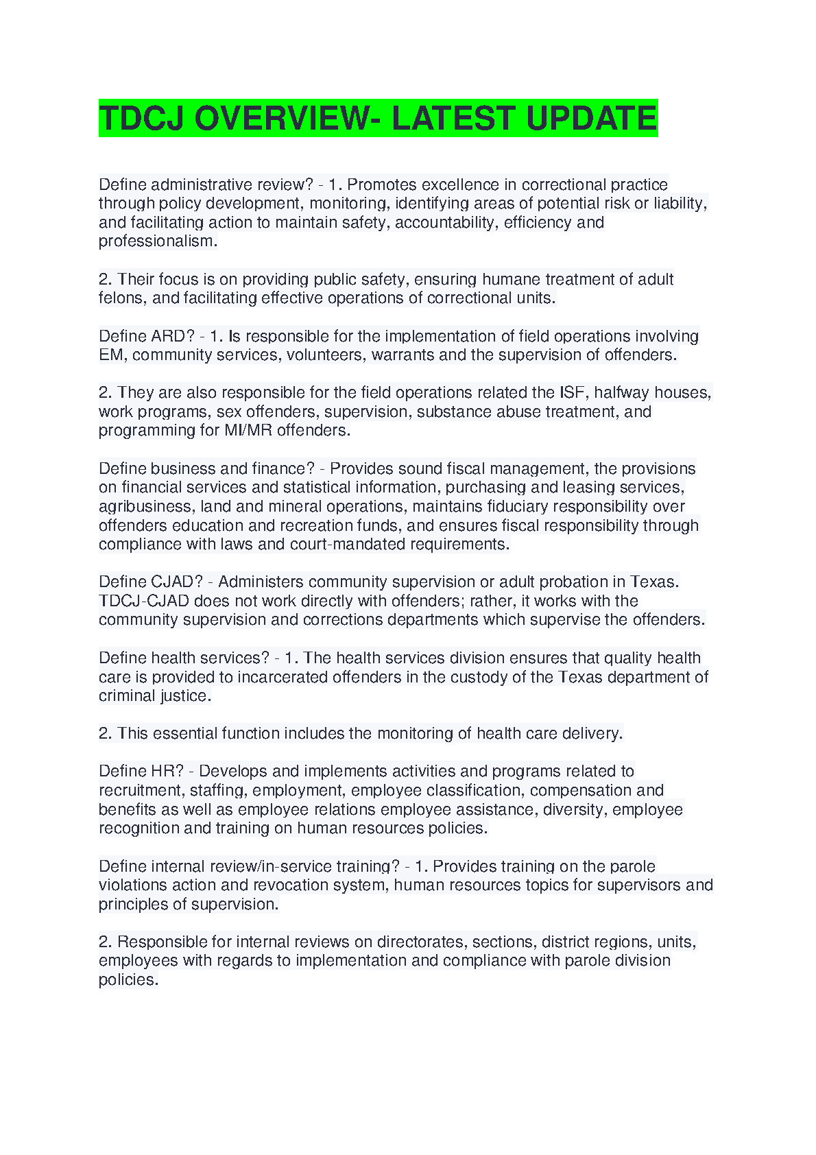 Ace your Texas Department of Criminal Justice (TDCJ) exam on the first try with our comprehensive 2025/2026 study guide. This essential resource provides the latest, in-depth overview of key TDCJ divisions and their functions, ensuring you have the knowledge needed to succeed. Master topics including Administrative Review, Community Justice Assistance Division (CJAD/ARD), Business and Finance, Health Services, Human Resources, and Internal Review/In-service Training. This guide is expertly designed to help you avoid resits by clarifying complex concepts and focusing on what you need to know to pass. Get prepared and confident for your correctional officer or related TDCJ career exams today!