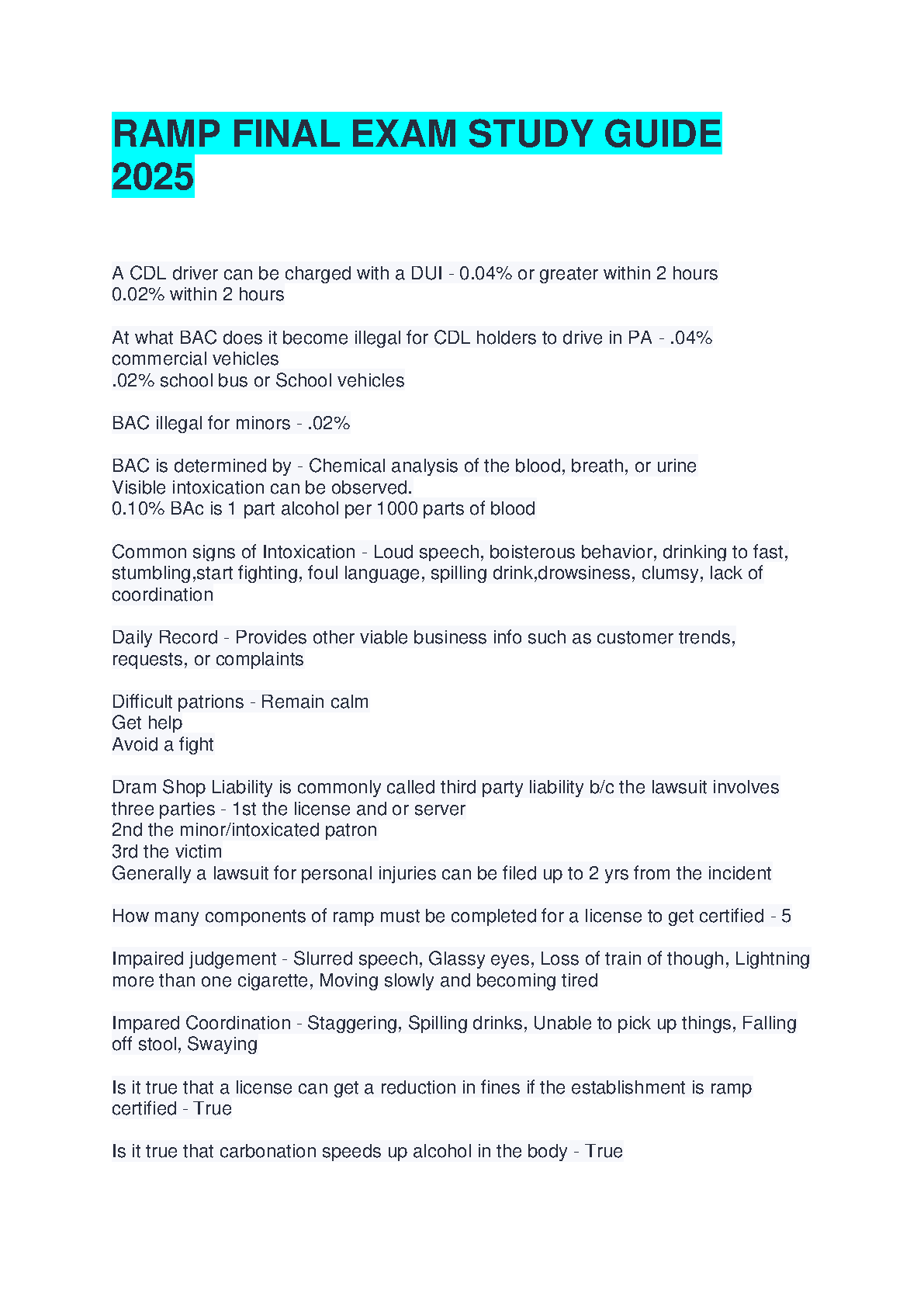Get fully prepared for your Responsible Alcohol Management Program (RAMP) final exam with this comprehensive 2025/2026 study guide. This resource is expertly designed to help servers, bartenders, and managers in the hospitality industry ace their certification test on the very first attempt. Inside, you'll find a detailed breakdown of all critical topics, including Blood Alcohol Concentration (BAC) limits, Dram Shop Liability, identifying signs of intoxication, and the specific requirements for RAMP certification. Stop worrying about resits—this guide provides the essential questions and verified answers you need for success. Download now and get certified with confidence!