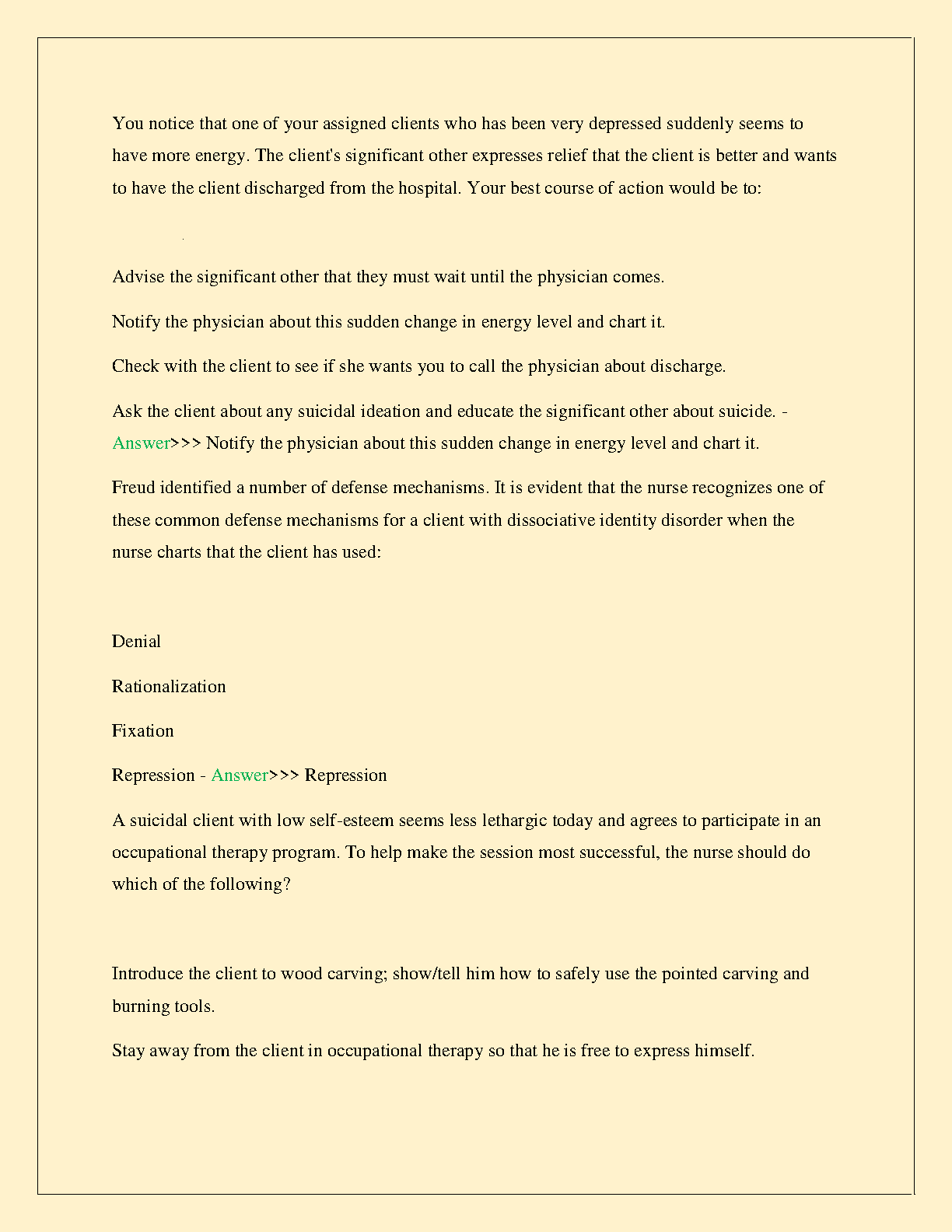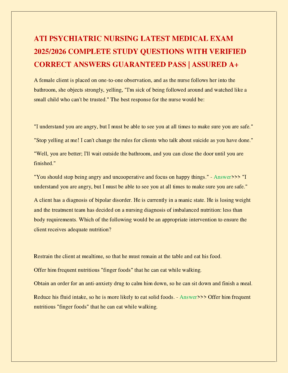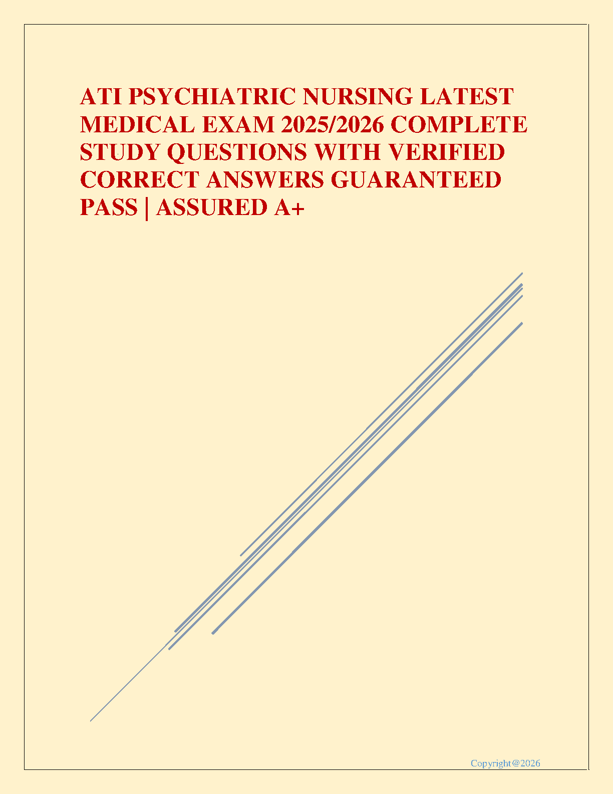 Excel in your upcoming ATI Psychiatric Nursing exam with our expertly compiled 2025/2026 study guide. This comprehensive resource is packed with the most current study questions and 100% verified correct answers, specifically designed to cover all key topics in RN Mental Health. Stop worrying about resits and secure your A+ grade with confidence. This guide is your key to passing the ATI proctored exam on your very first attempt.