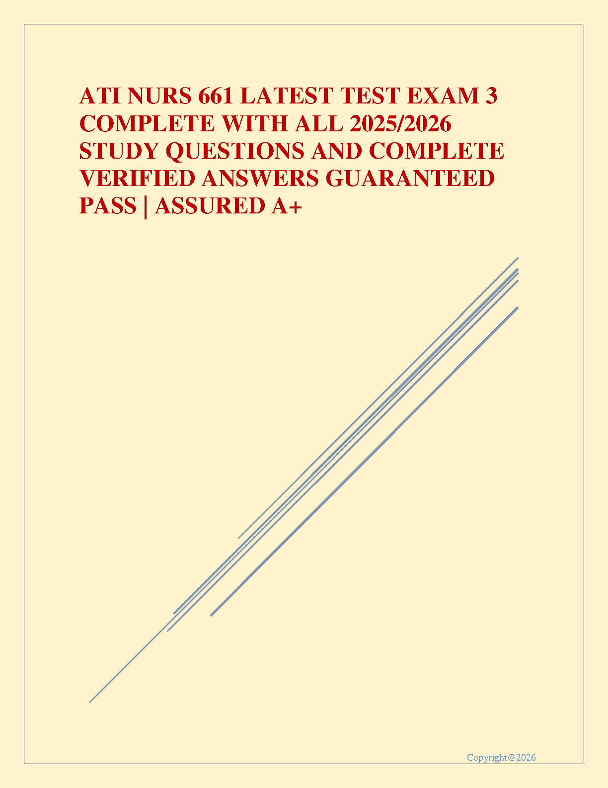 Prepare to excel in your ATI NURS 661 Exam 3 with our latest 2025/2026 test bank. This essential study guide features a complete collection of meticulously compiled study questions and fully verified answers, ensuring you have the most accurate and relevant material. Designed to help you pass on your first attempt and achieve an A+ grade, this resource covers all key topics you'll face on the exam. Elevate your study sessions and gain the confidence to succeed without the stress of resits.