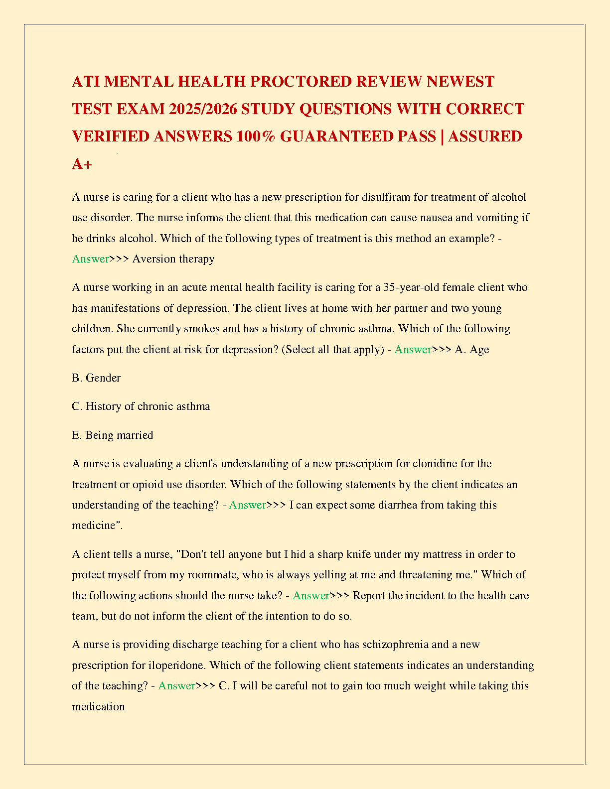 Master the ATI Mental Health Proctored Exam with our latest and most comprehensive 2025/2026 edition test bank. This study resource is expertly designed to help you ace your exam on the very first attempt. Inside, you'll discover a complete collection of the newest study questions, each paired with 100% correct and verified answers. Eliminate exam anxiety and avoid resits. This guide is your definitive key to not just passing, but achieving an A+. Study smarter, prepare confidently, and secure your success in mental health nursing.