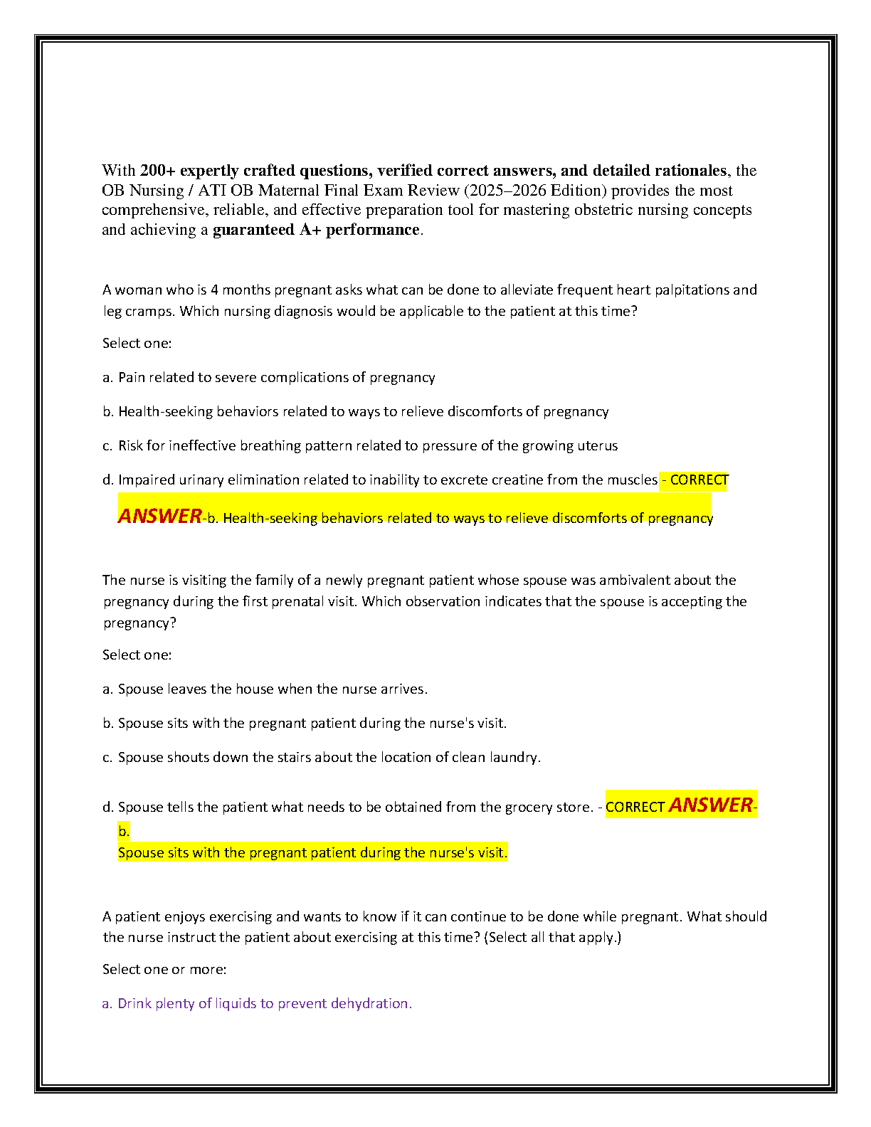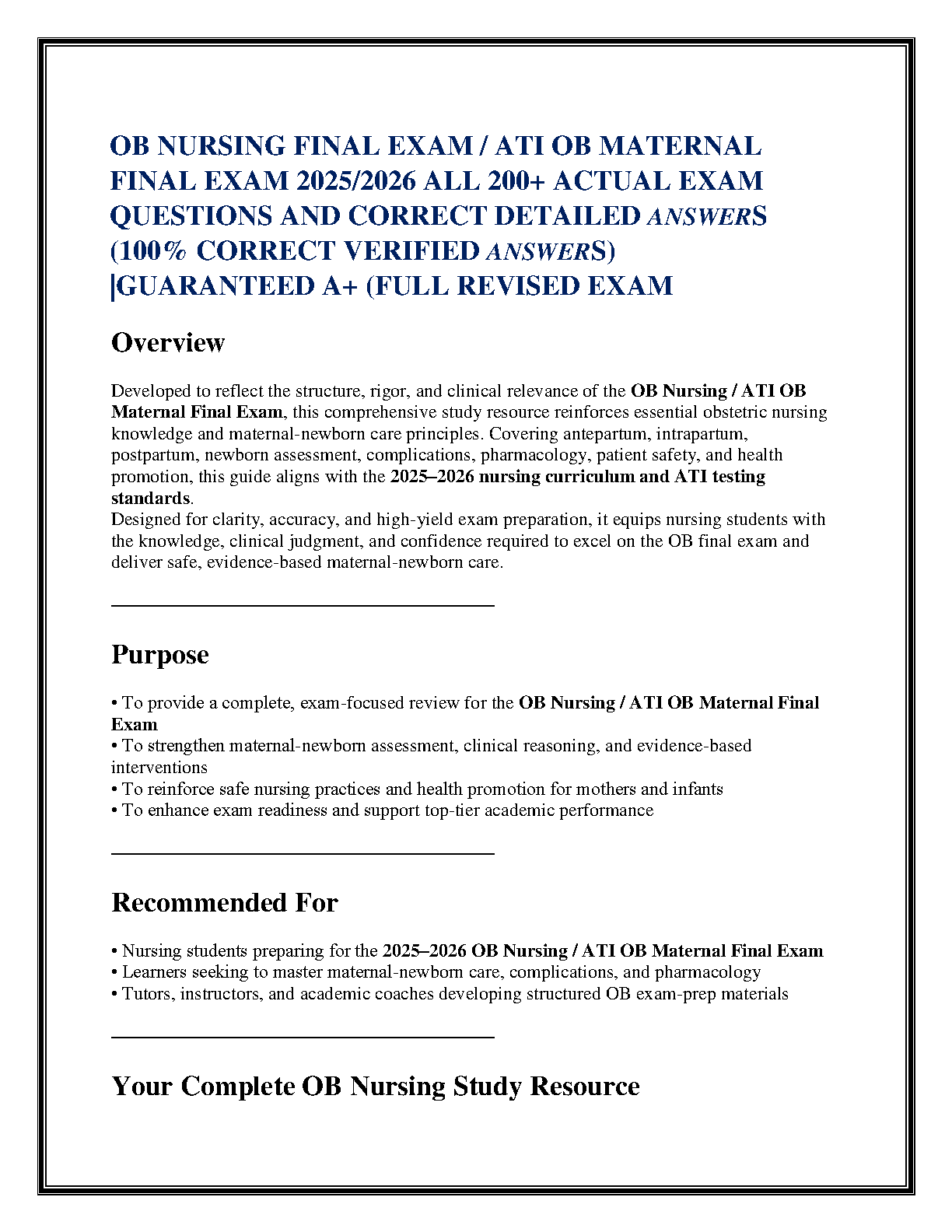 Ace your OB Nursing and ATI OB Maternal Final Exam with our fully revised 2025/2026 study guide. This comprehensive resource is expertly designed to help you pass on your very first attempt, avoiding costly and stressful resits. Inside, you'll find over 200 actual exam questions, each with a correct, detailed, and verified answer. This guide is perfectly aligned with the latest 2025-2026 nursing curriculum and ATI testing standards, covering all essential topics: antepartum, intrapartum, postpartum care, newborn assessment, complications, pharmacology, and patient safety. Build the knowledge, clinical judgment, and confidence you need to excel and secure an A+ grade. Ideal for nursing students seeking a complete, exam-focused review to master maternal-newborn care.