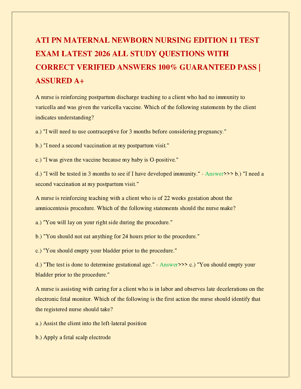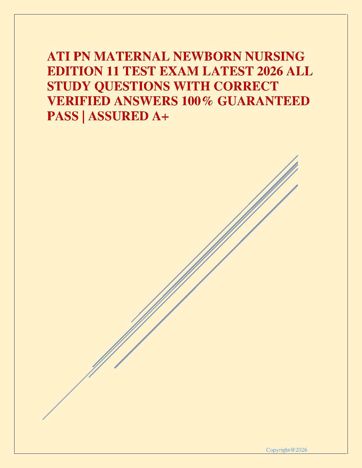 Unlock your potential and guarantee success in your nursing studies with the latest 2026 Test Bank for ATI PN Maternal Newborn Nursing, 11th Edition. This comprehensive resource is packed with a full range of study questions and 100% correct, verified answers. It's expertly designed to help you master complex topics, ace your exams with an A+, and confidently pass on your very first attempt, eliminating the stress of resits. Get the ultimate study partner to excel in your maternal and newborn nursing course.