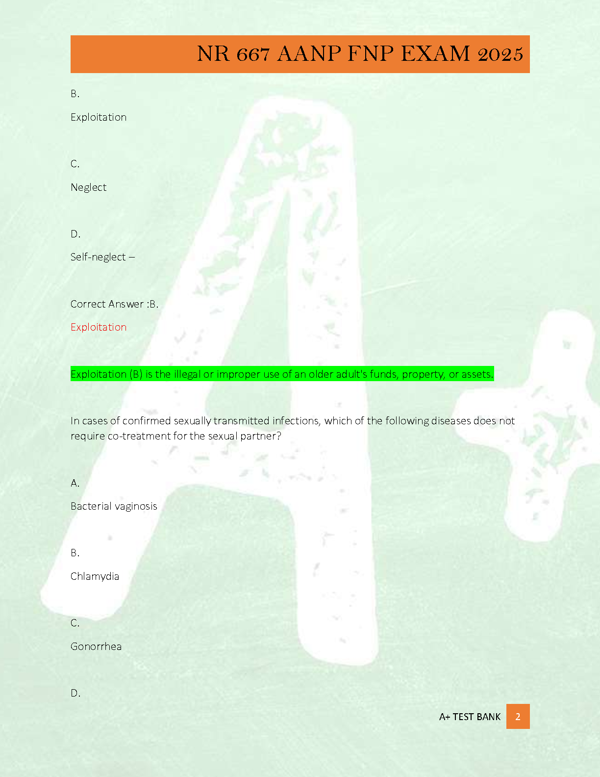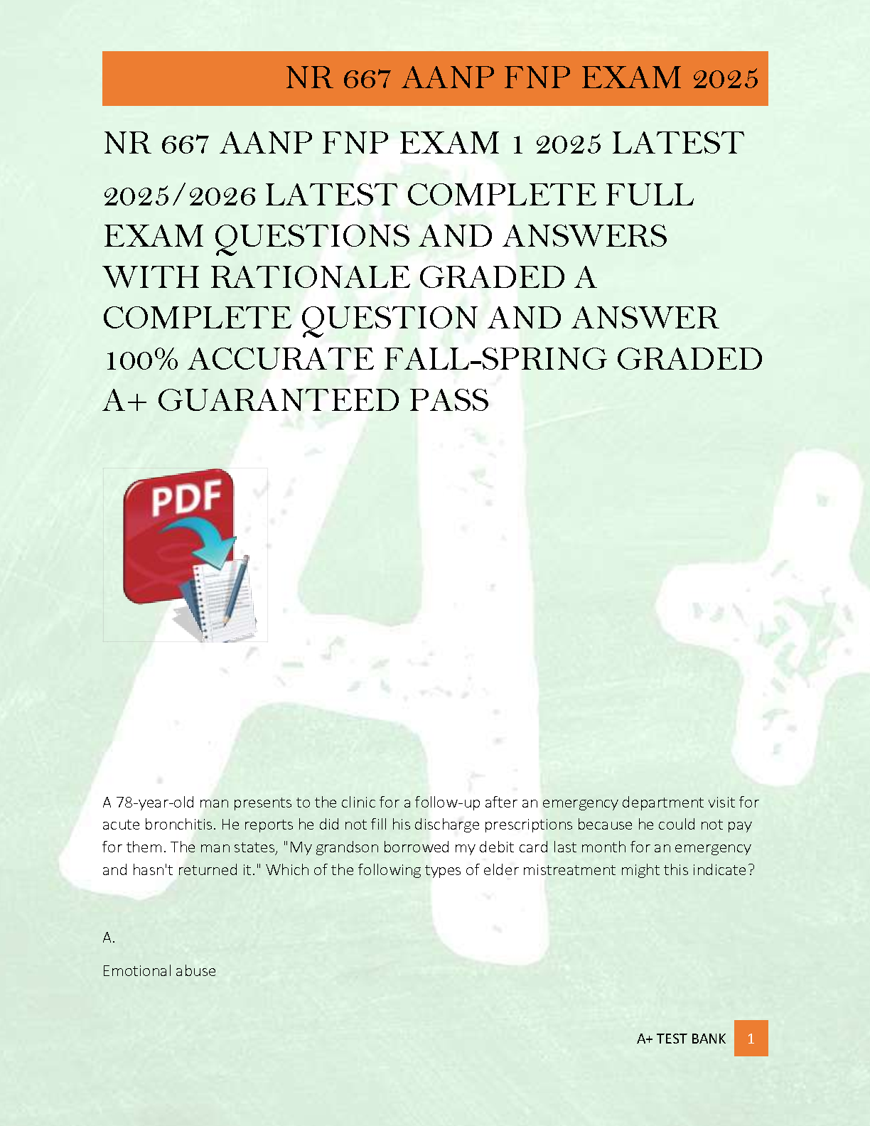 Unlock your potential and ace the NR 667 AANP FNP Exam on your first try with our latest 2025/2026 test bank. This comprehensive resource is expertly designed for students in the FNP Capstone Practicum and Intensive course. It features a complete collection of exam questions, 100% accurate answers, and detailed rationales for each. This study guide is your key to mastering the material, avoiding resits, and achieving a guaranteed A+ grade. Download the PDF now and start your journey to becoming a certified Family Nurse Practitioner.