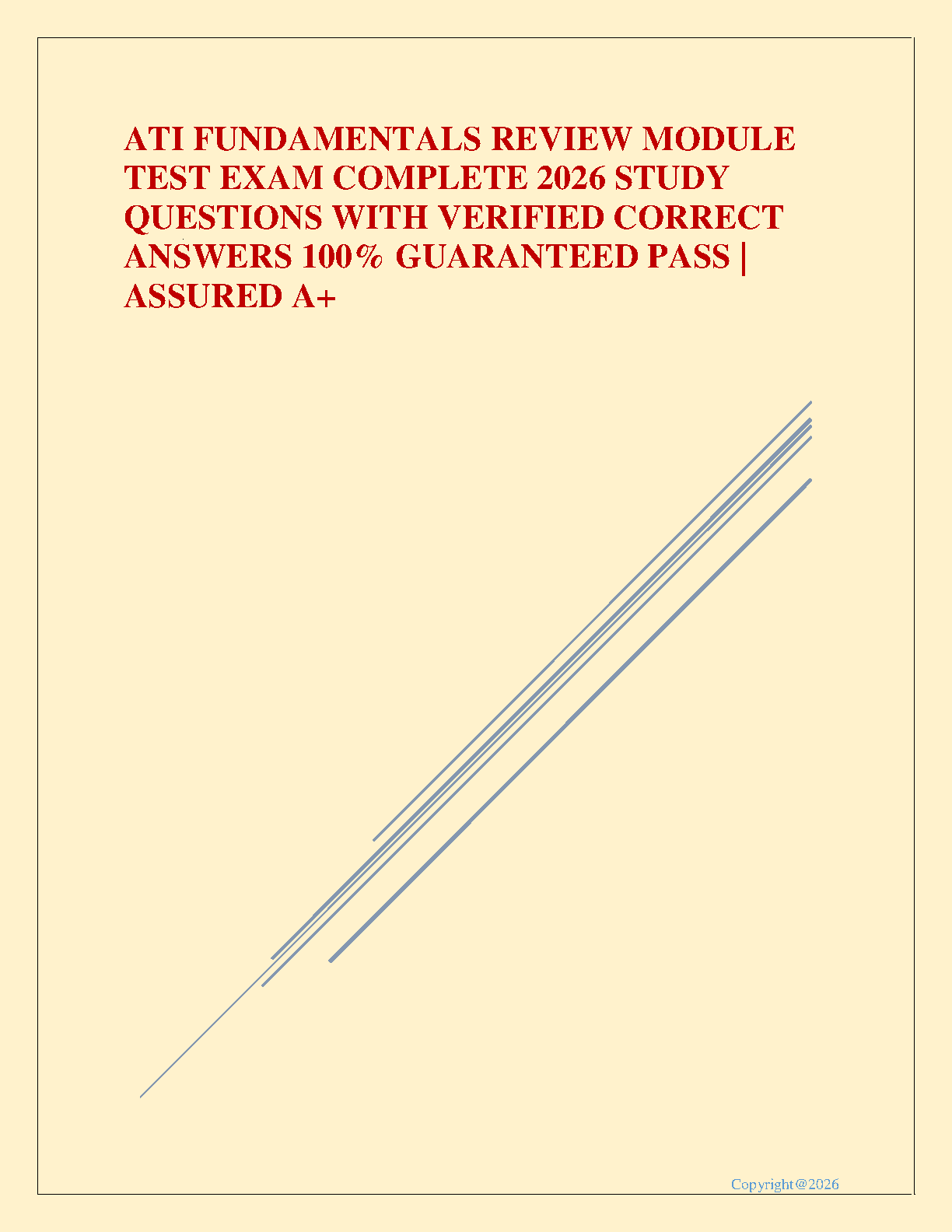 Master the core concepts of nursing with the ultimate study resource for the ATI Fundamentals Review Module. Our comprehensive 2026 test bank is expertly designed to help you ace your exam on the first try. It features a complete set of test questions paired with verified, 100% correct answers, ensuring you understand the material thoroughly. Stop worrying about resits and secure your A+ grade with this essential study tool, updated for the 2025/2026 academic year.
