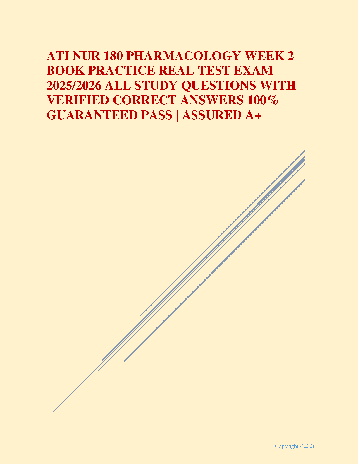 Unlock success in your nursing program with our latest 2025/2026 Test Bank for ATI NUR 180 Pharmacology, focusing on Week 2 material. This comprehensive resource is packed with real exam questions and 100% verified correct answers, meticulously designed to ensure you master the subject. Ace your exams on the first try, avoid resits, and secure an A+ grade with this essential study guide. Perfect for students aiming for in-depth understanding and top scores.