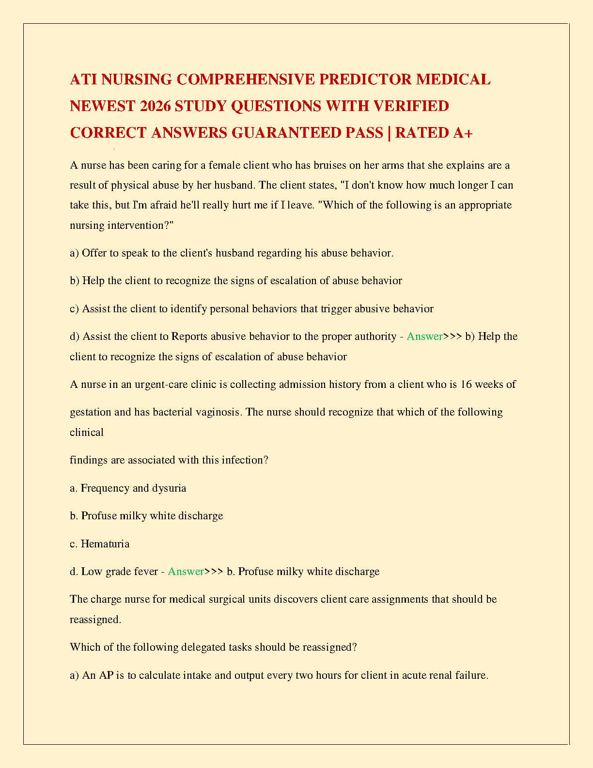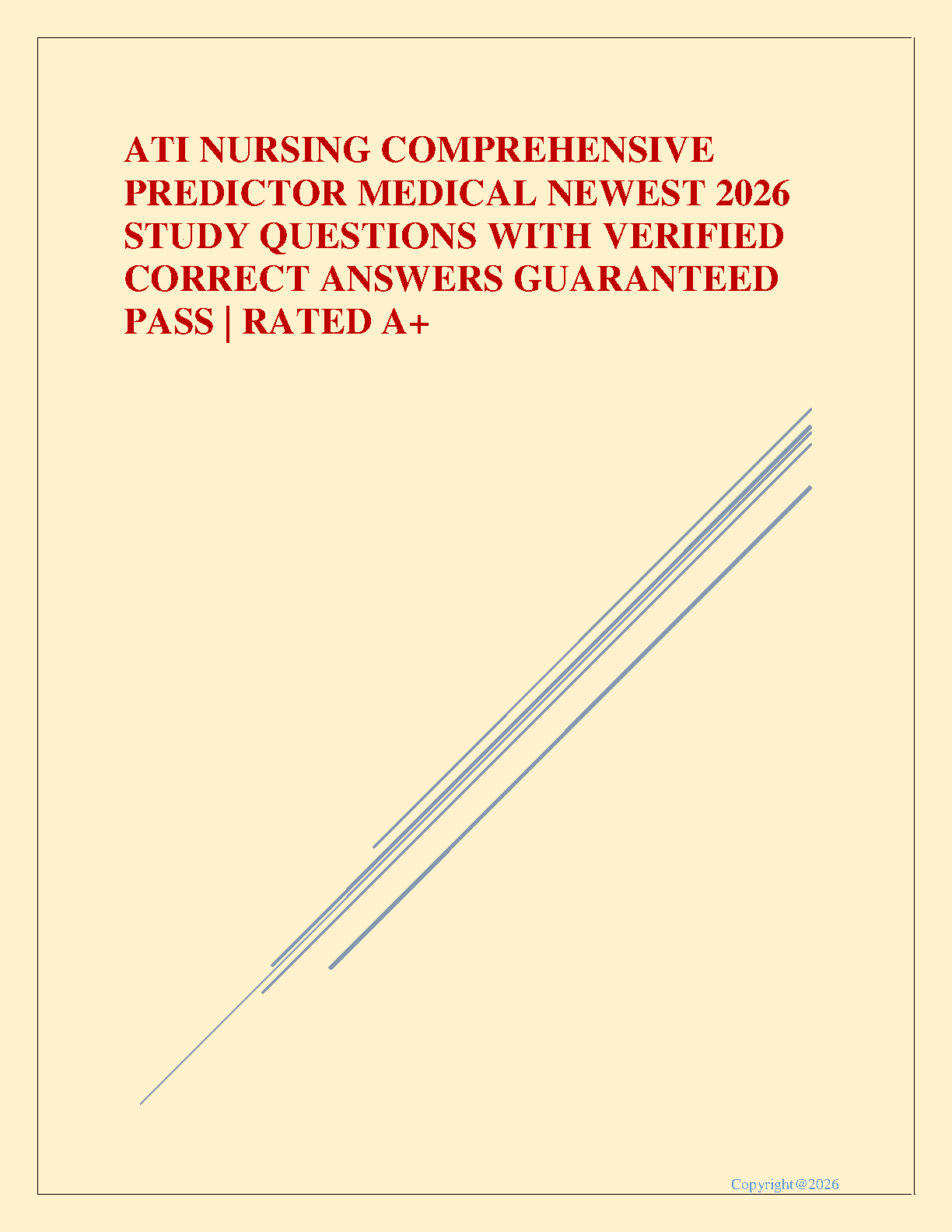 Ace your ATI Nursing Comprehensive Predictor Medical exam with confidence! This brand-new 2025/2026 study resource provides a complete collection of the latest study questions, each accompanied by a verified, correct answer. Designed to mirror the actual exam, this guide is your key to mastering complex medical concepts and ensuring you pass on your very first attempt. Avoid the stress of resits with our top-rated, A+ material and get fully prepared for your nursing career.