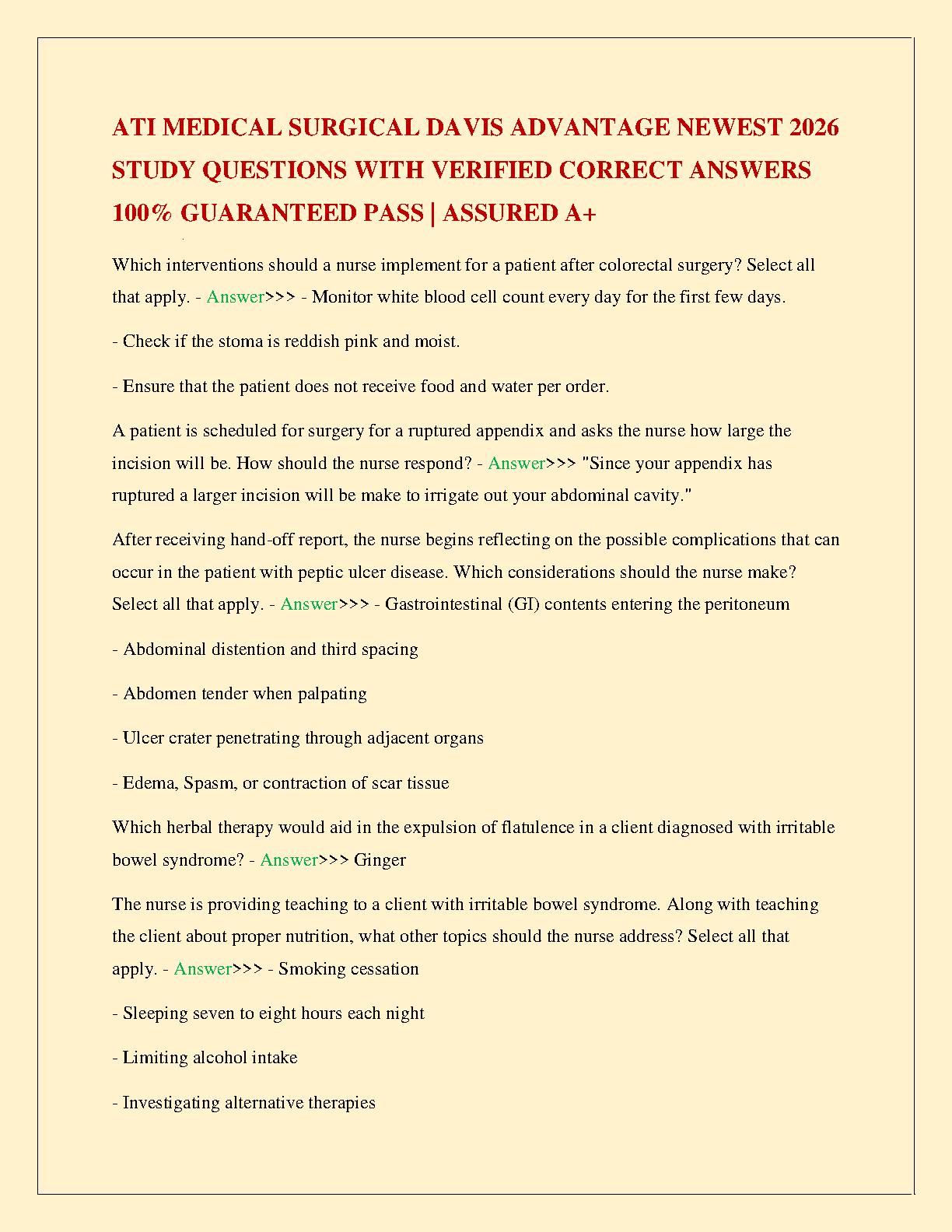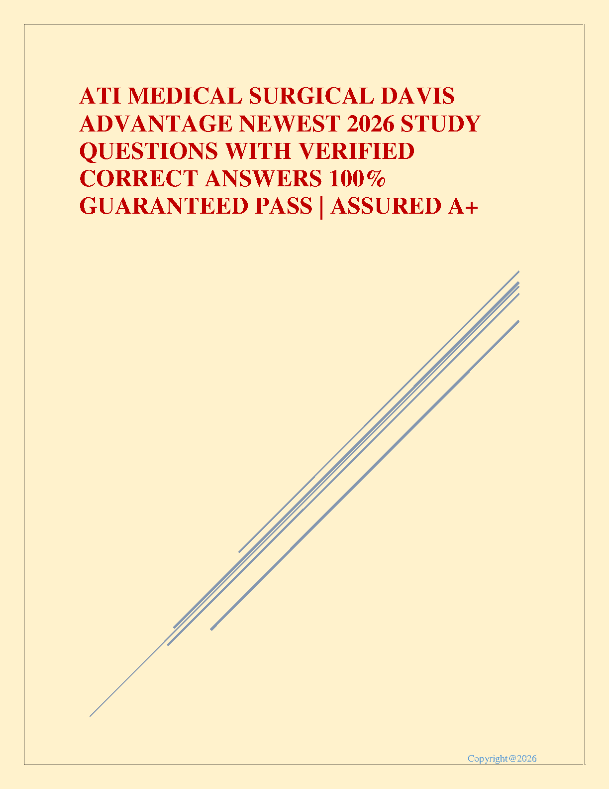 Ace your nursing exams with our comprehensive ATI Medical-Surgical: Davis Advantage Test Bank for the 2026 curriculum. This indispensable study guide is packed with the newest exam questions and 100% verified correct answers, meticulously compiled to ensure you master the course material. Stop struggling and start succeeding! Our resource is your key to not just passing, but achieving an A+ on your first attempt. Download now and gain the confidence you need to excel in your medical-surgical nursing course.