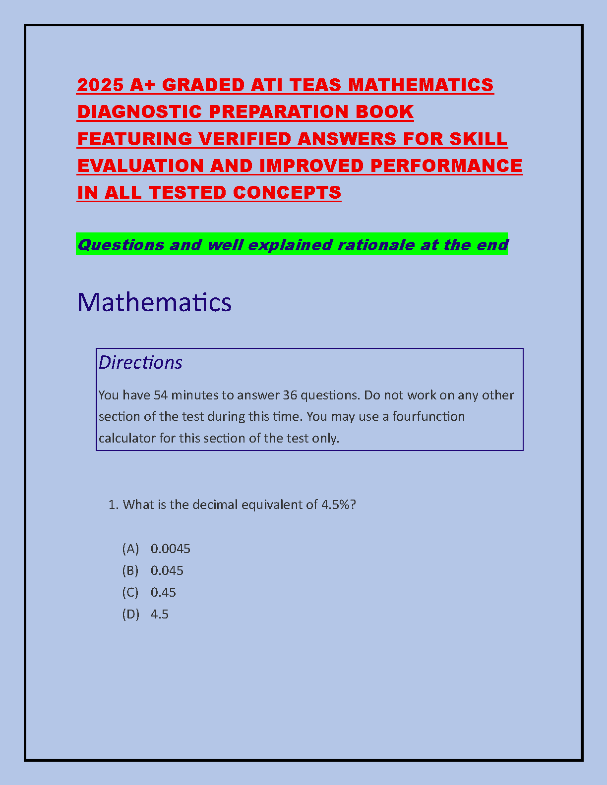 Master the Mathematics section of the ATI TEAS 7 exam and secure your spot in nursing school with our latest 2025/2026 edition test bank. This comprehensive resource is packed with A+ graded practice questions that mirror the real exam, covering every essential concept you'll be tested on. Each question comes with a verified answer and a detailed, easy-to-understand rationale, allowing you to learn from your mistakes and solidify your understanding. Designed as a diagnostic tool, this preparation guide helps you evaluate your skills, identify areas for improvement, and build the confidence needed to pass on your very first attempt, avoiding costly resits.
