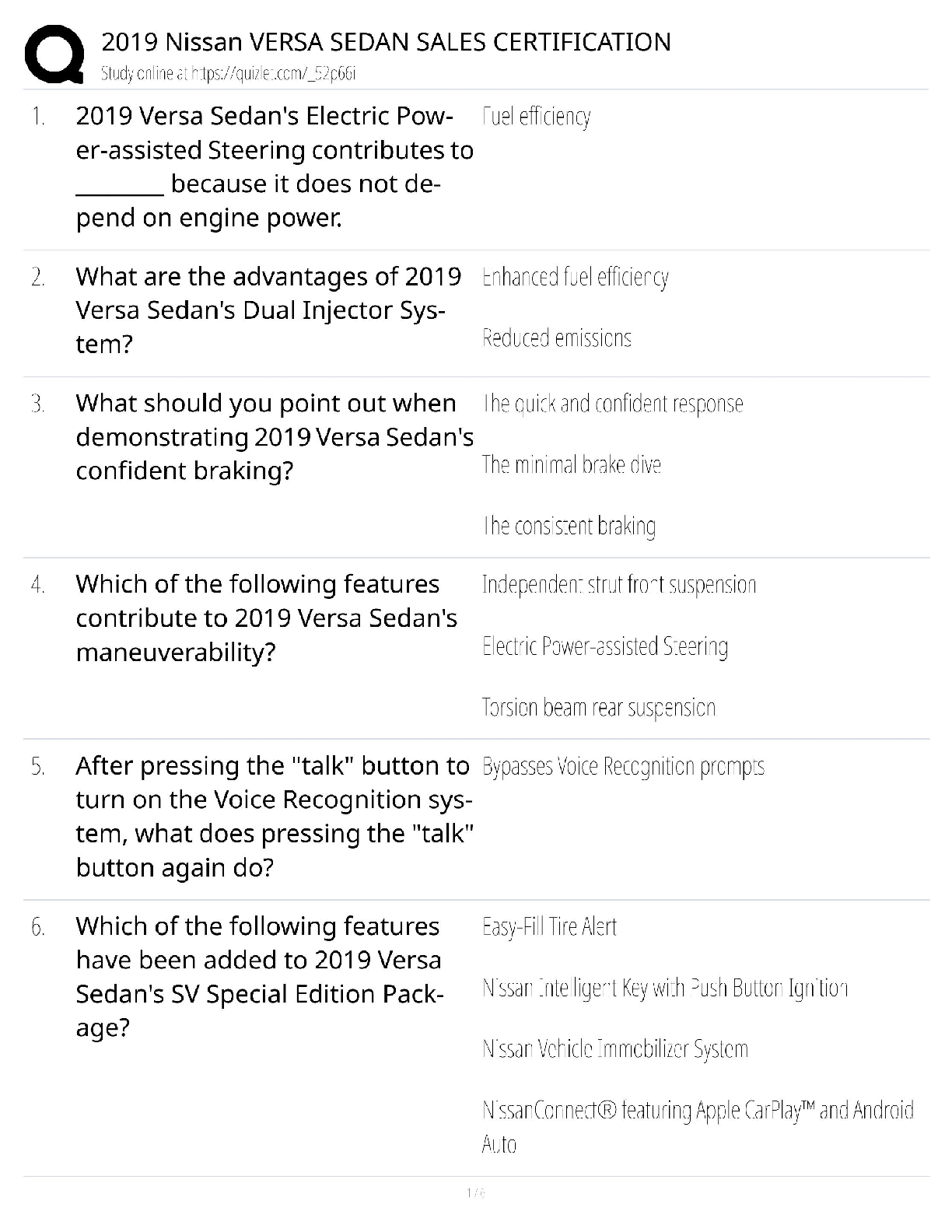 Nissan Versa Sedan 2019 Sales Certification Exam Q&A | Complete Test Bank