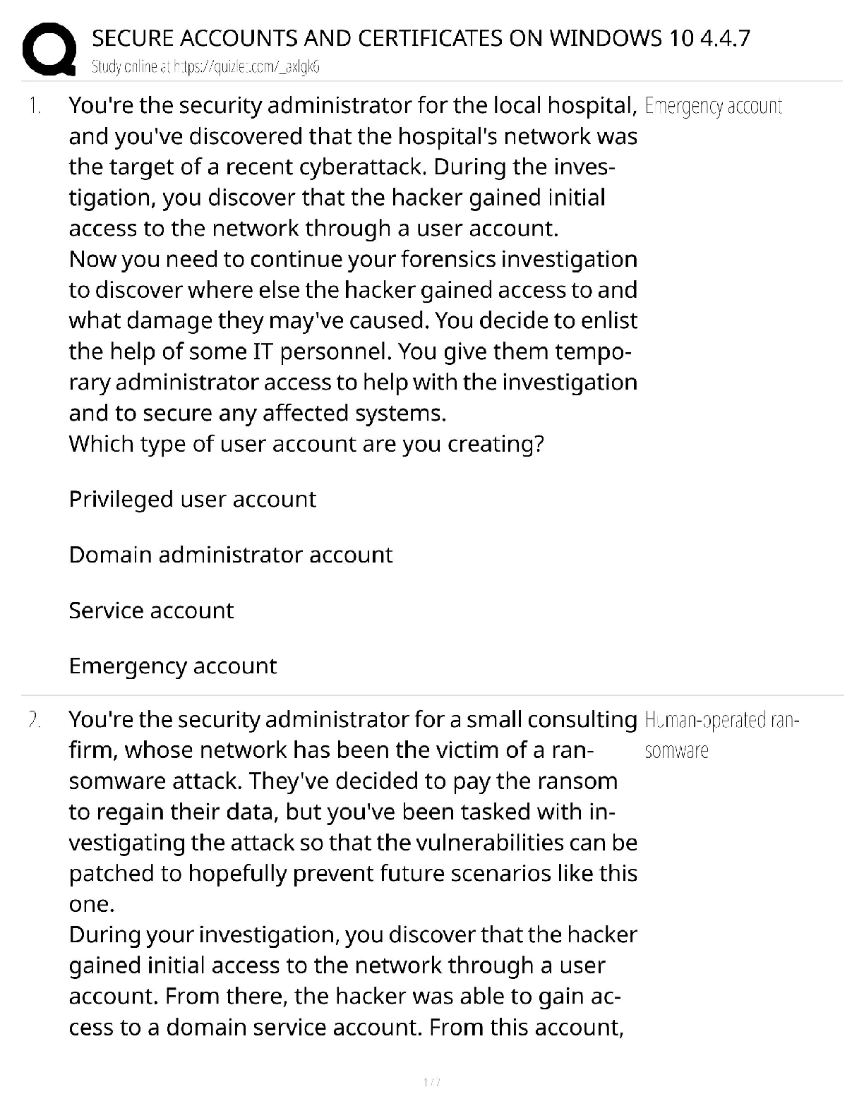 Ace your IT security exams with this up-to-date 2025/2026 test bank focused on 'Secure Accounts and Certificates on Windows 10.' This essential resource features a curated collection of scenario-based questions that challenge your understanding of real-world cybersecurity situations, including post-breach forensic investigations, ransomware attack responses, and the proper use of privileged, domain, service, and emergency accounts. Each question is designed to build your critical thinking and problem-solving skills, providing the perfect preparation to help you master the material and pass your certification exam on the very first attempt.