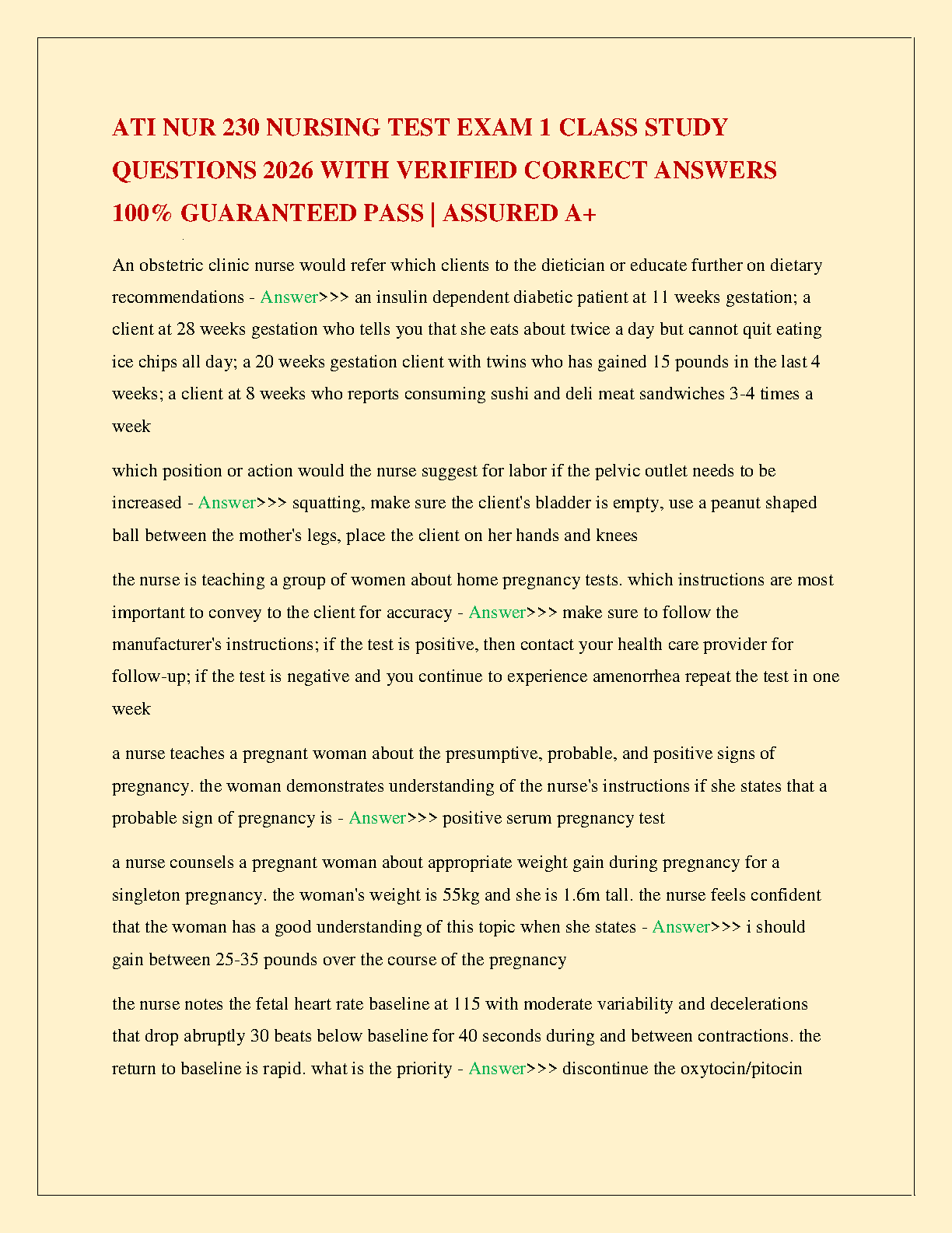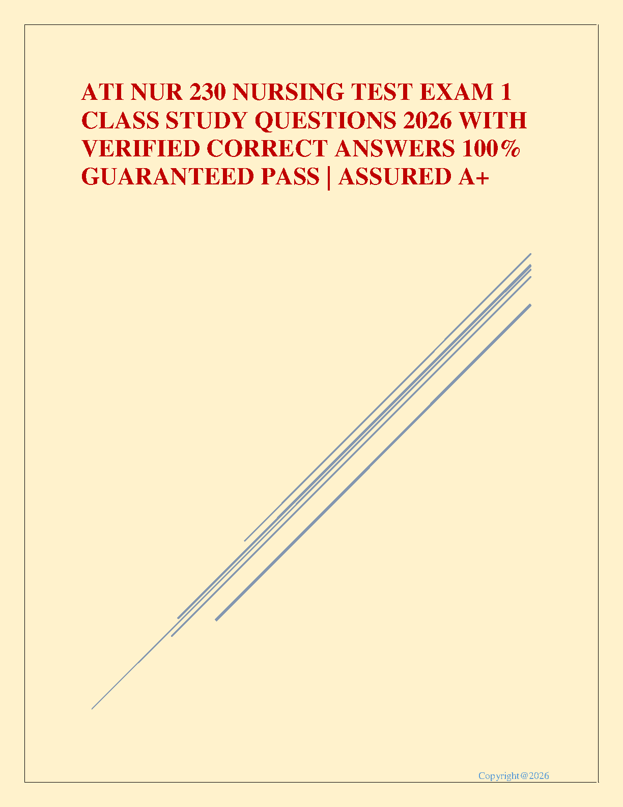 Excel in your nursing studies with the complete test bank for ATI NUR 230 Nursing Test Exam 1. This 2026 edition features a comprehensive collection of study questions paired with 100% verified correct answers. Designed to ensure your success, this resource is your key to achieving an A+ and passing your exam on the first try. Master the course material with confidence and avoid resits.