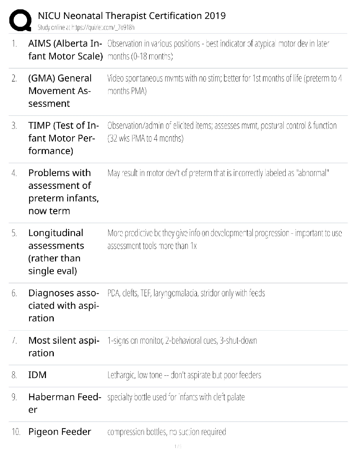 Unlock your potential and pass the NICU Neonatal Therapist Certification exam with confidence! This comprehensive 2025/2026 study guide provides a detailed breakdown of all critical topics you need to know. Master key assessment tools like the Alberta Infant Motor Scale (AIMS), General Movement Assessment (GMA), and the Test of Infant Motor Performance (TIMP). Gain in-depth knowledge on identifying diagnoses associated with aspiration, understanding feeding challenges, and utilizing specialized equipment. This essential resource is designed to streamline your learning process, ensuring you grasp the core concepts needed to succeed on your first attempt and avoid costly resits.