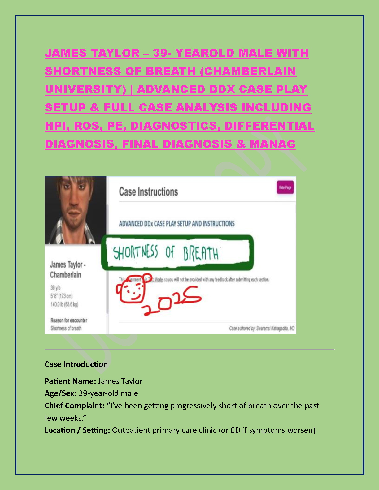 Master your Chamberlain University Advanced DDx course with this comprehensive 2025/2026 case analysis of James Taylor, a 39-year-old male with shortness of breath. Authored by Swaramsi Katragadda, MD, this essential study aid provides a deep dive into the full case, including HPI, ROS, PE, diagnostics, differential diagnosis, final diagnosis, and a complete management plan. Designed to help you ace your exams on the first attempt, this guide is your key to avoiding resits and achieving academic success.