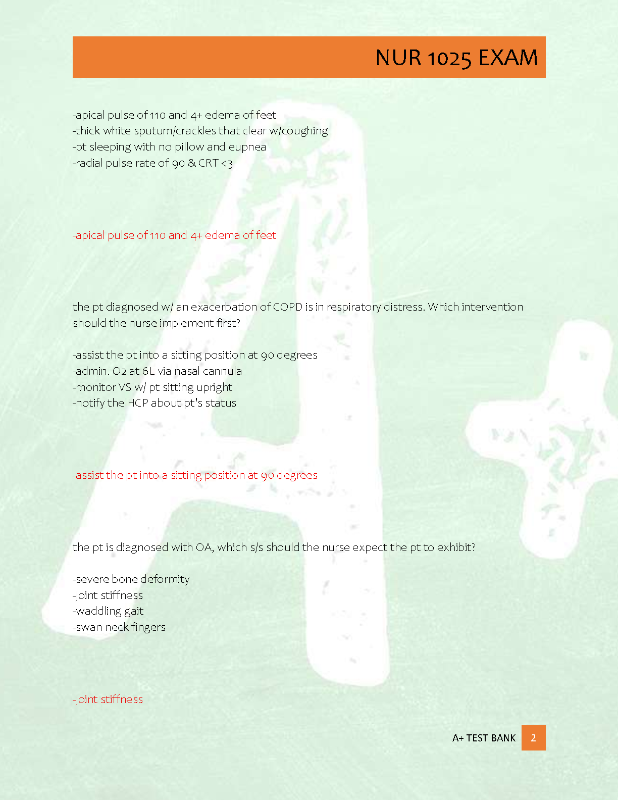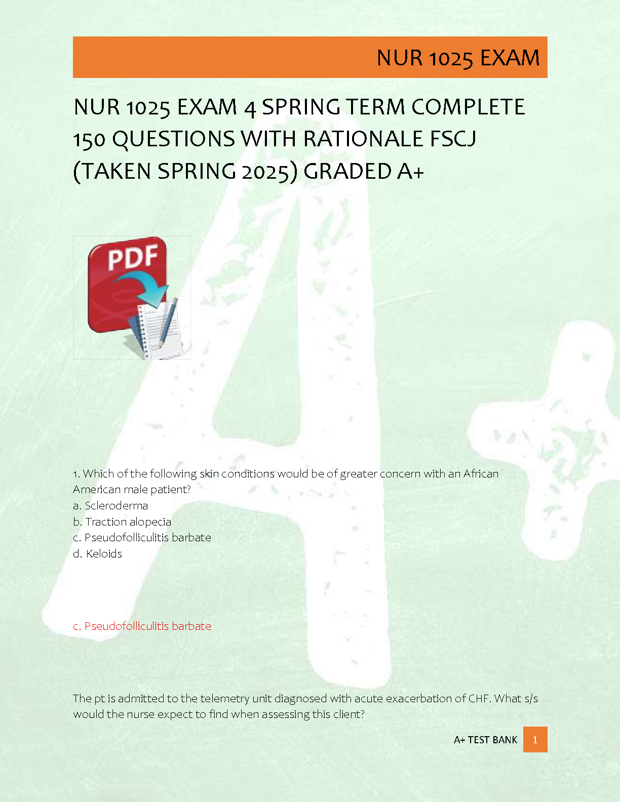 Ace your NUR 1025 Exam 4 with this comprehensive A+ graded test bank from Florida State College at Jacksonville (FSCJ). This latest Spring 2025 study guide features a complete set of 150 exam questions, each accompanied by a detailed rationale to ensure you understand the core concepts. This is the ultimate resource designed to help you master the material, pass your exam on the first attempt, and avoid resits. Get immediate access to verified answers and achieve top grades.