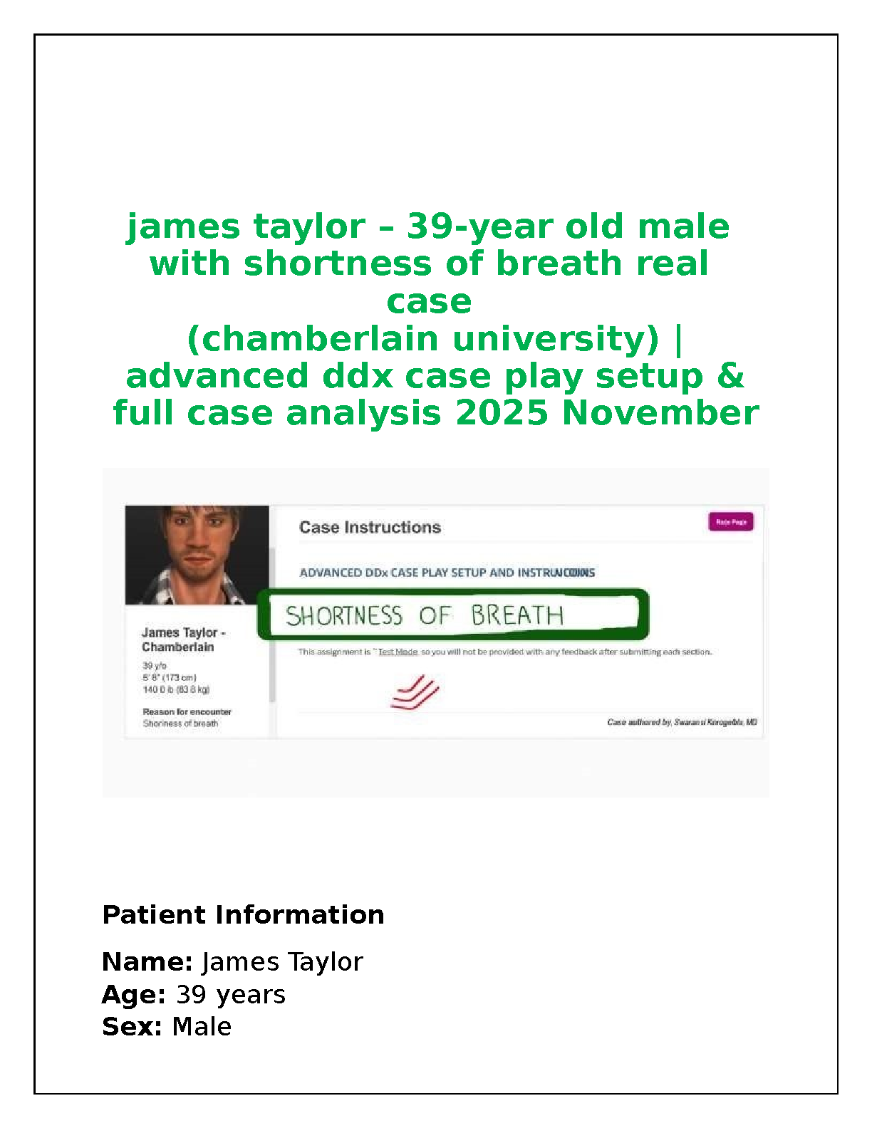 Ace your Chamberlain University assessments with this comprehensive guide to the iHuman case study of James Taylor, a 39-year-old male presenting with shortness of breath. This essential resource provides a full case analysis, including the Advanced DDx case play setup and expert insights. Meticulously prepared for the 2025/2026 academic year, this guide is designed to help you navigate the simulation successfully, ensuring you pass your exams on the first attempt and avoid costly resits. Master the differential diagnosis process and secure the grade you deserve.