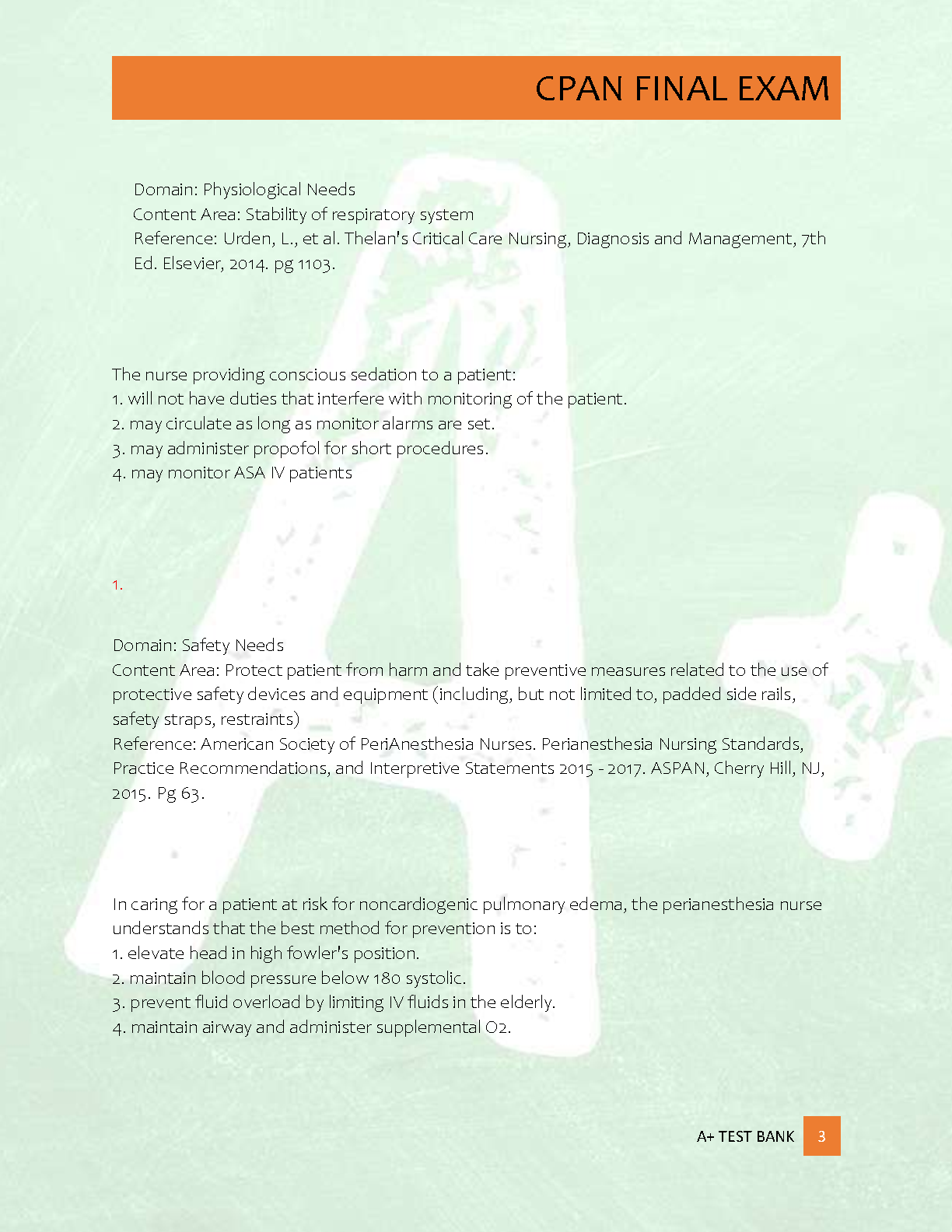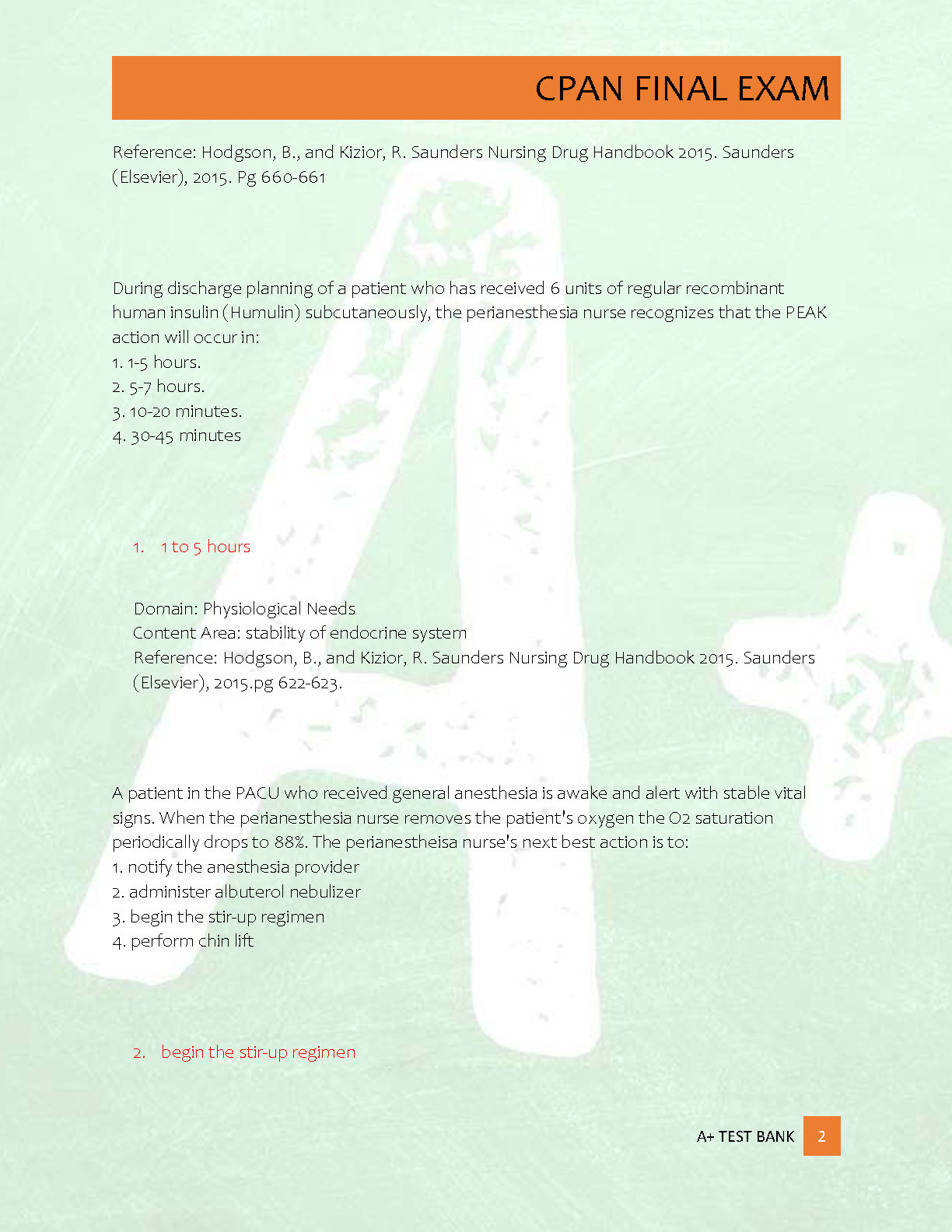 Ace your Certified Post Anesthesia Nurse (CPAN) certification with our comprehensive test bank for the final exam. This latest version resource is packed with 300 complete practice questions, each accompanied by a correct, detailed, and verified answer. Designed to simulate the real exam experience, this A+ graded material covers all essential domains, including Physiological Needs. Get immediate access to this brand new version and study effectively to pass your CPAN exam on the first try.