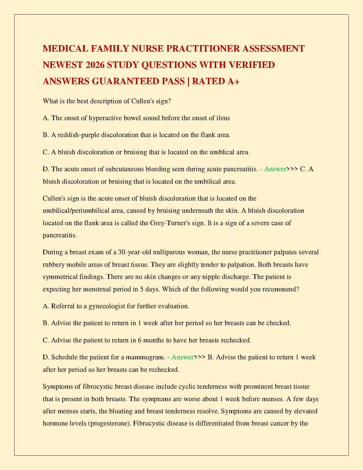 Ace your Medical Family Nurse Practitioner Assessment with confidence! This comprehensive test bank for the 2025/2026 academic year is your ultimate study tool, featuring the latest 2026 study questions complete with detailed, verified answers. Designed to help you master key concepts and pass your exams on the first try, this resource is meticulously curated to ensure you achieve an A+ grade. Avoid resits and step into your exam fully prepared. Download now for a guaranteed pass!