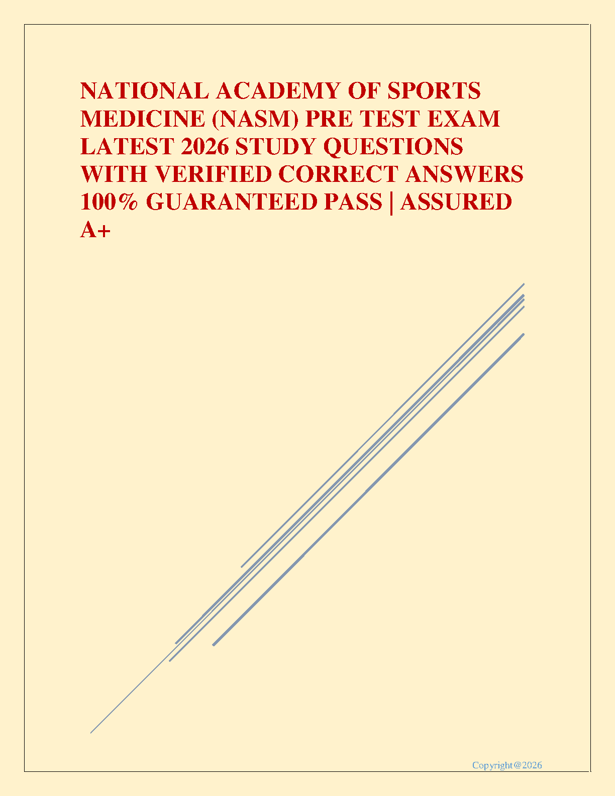 Ace your National Academy of Sports Medicine (NASM) CPT exam with our ultimate 2026 test bank. This guide features the latest pre-test exam questions, complete with verified and 100% correct answers. Developed based on the core curriculum by Micheal A. Clark, Scott C. Lucett, and Brian G. Sutton, this resource is designed to ensure you pass on your first attempt, saving you from the stress and cost of resits. Unlock an A+ result and start your personal training career with confidence.