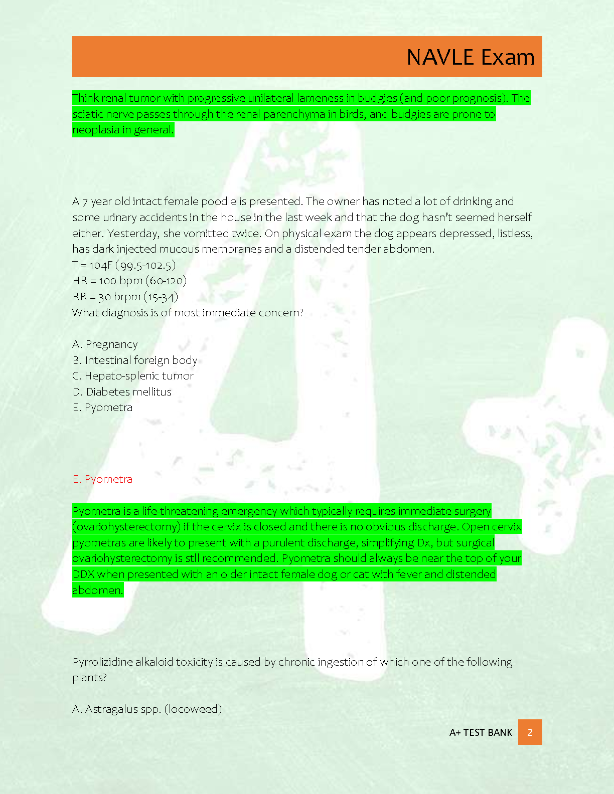 Ace your North American Veterinary Licensing Examination (NAVLE) with our comprehensive Test Bank for Practice Exam 1. This brand-new, A+ graded resource features 200 meticulously crafted questions, each accompanied by correct, detailed, and verified answers. This study guide is designed to simulate the real exam, covering a wide range of veterinary topics. Prepare effectively, understand the rationale behind each answer, and walk into your NAVLE test day with the confidence to pass on your first attempt.