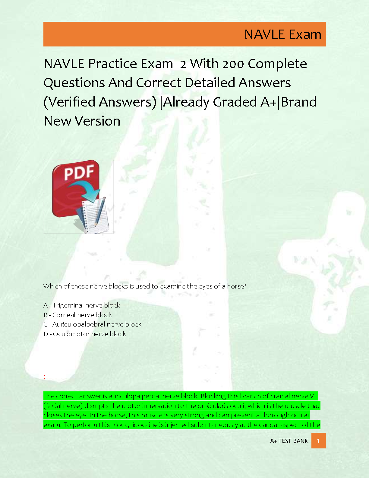 Unlock your potential and pass the North American Veterinary Licensing Examination (NAVLE) with confidence using this comprehensive Test Bank. This brand-new edition of Practice Exam 2 features 200 meticulously crafted questions, each accompanied by detailed, verified answers that have already been graded A+. This essential study tool is designed to help you master critical concepts, understand the exam format, and achieve success on your first attempt. Download now to start your ultimate NAVLE preparation journey.