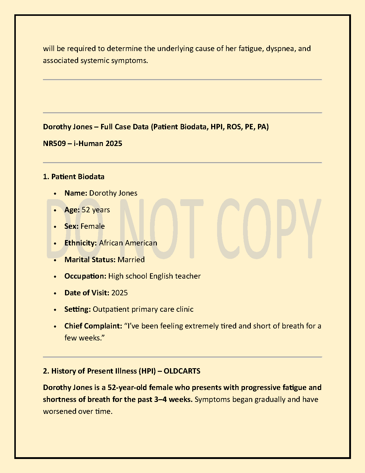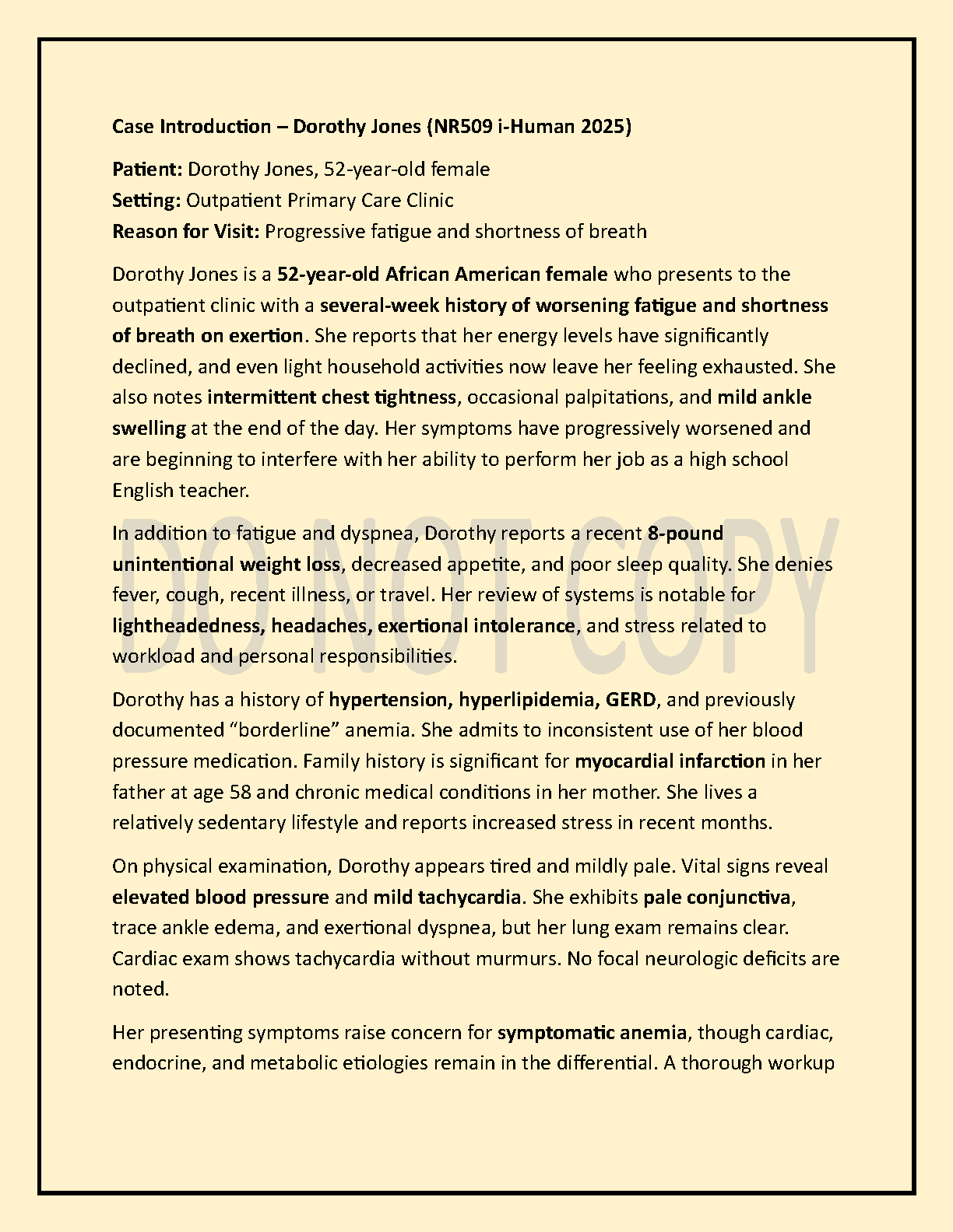 Struggling with the Dorothy Jones i-Human case in your NR509 course? Secure your A+ grade and master the clinical reasoning process with our comprehensive guide. This latest 2025/2026 resource provides a complete, 100% correct walkthrough for the Week Eight 'Chest Pain' scenario. Inside, you'll find the full HPI Q&A, a perfectly structured SOAP note, detailed diagnostics, a correctly ranked differential diagnosis (DDx), and a complete management plan with summary tables. Designed to help you pass on your first attempt and avoid resits, this study aid breaks down every step of the simulation. Understand the key findings, learn how to formulate an effective plan, and submit your work with confidence. Get the top score you deserve!