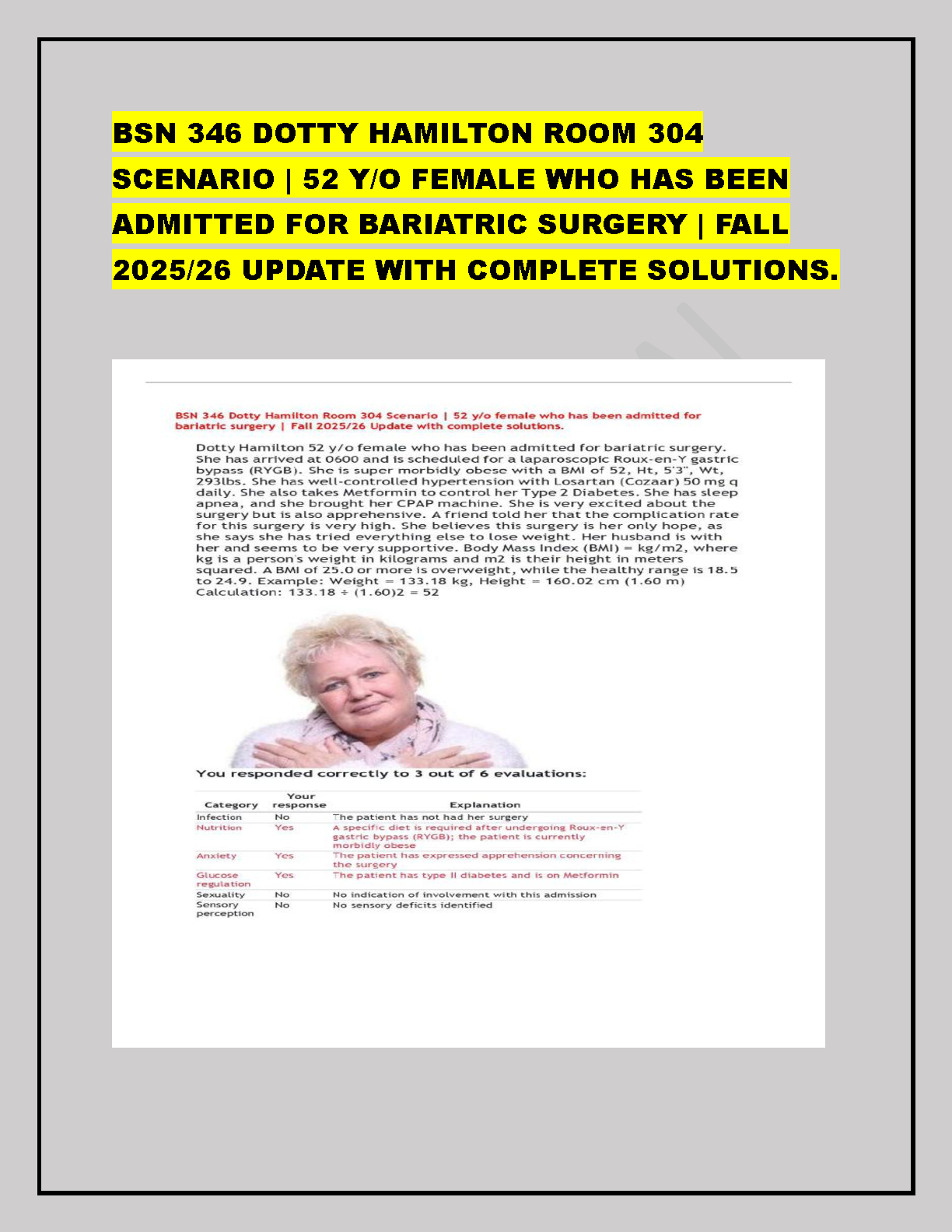 BSN 346 Dotty Hamilton Room 304 Scenario Test Bank: Bariatric Surgery | 2025/2026 Latest Edition with Verified Solutions