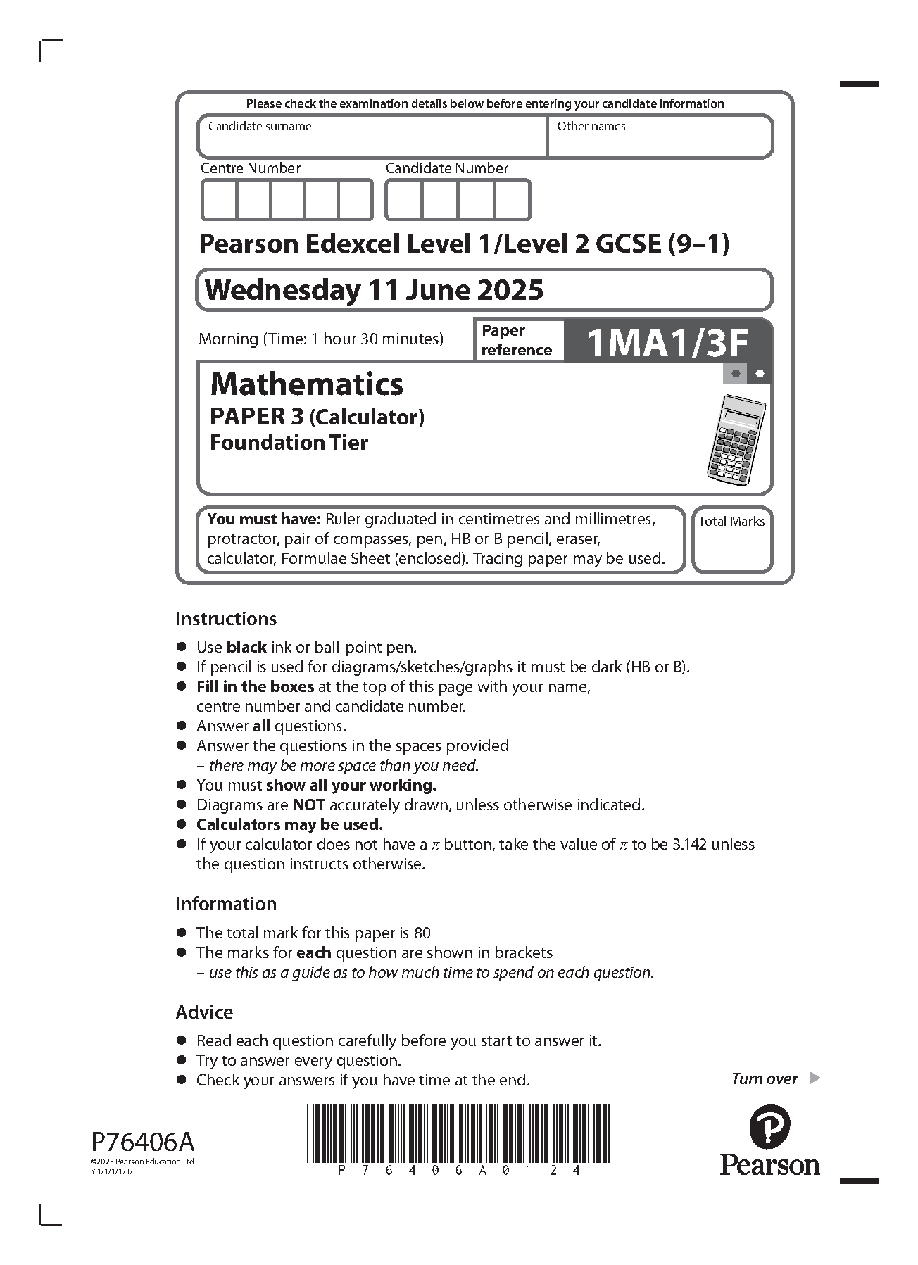 MERGED 2025 Pearson Edexcel GCSE Mathematics Paper 3F Question Paper and Mark Scheme (1MA1/3F: Calculator Foundation tier)