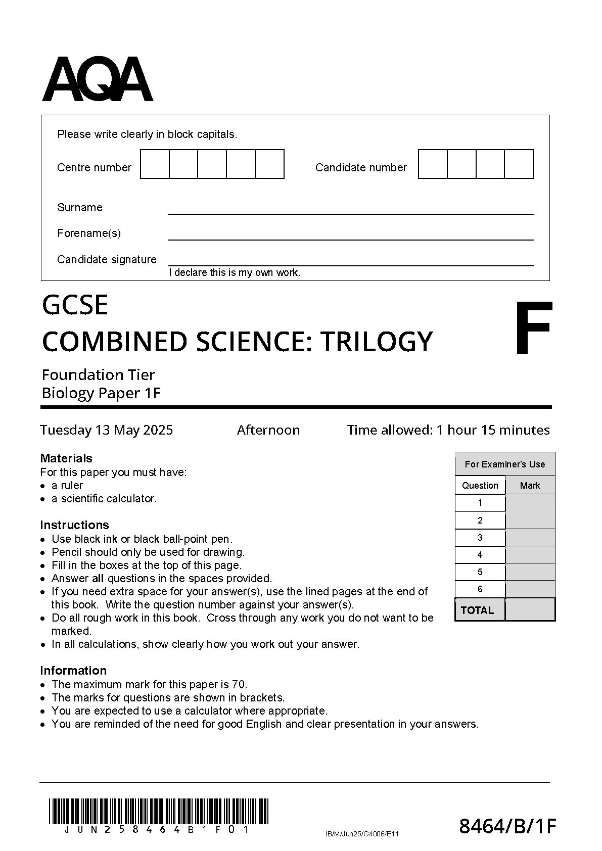 AQA GCSE COMBINED SCIENCE: TRILOGY BIOLOGY PAPER 1 2025 (8464/B/1F: Foundation Tier). DOWNLOAD this verified paper on www.hackedexams.com and access the PDF INSTANTLY!!!