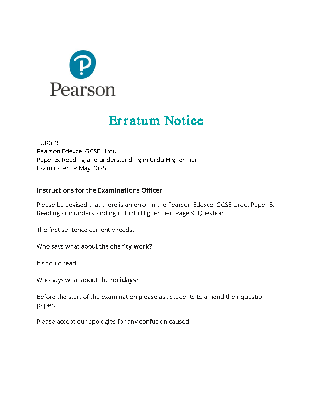 PEARSON EDEXCEL GCSE URDU PAPER 3 HIGHER TIER 2025