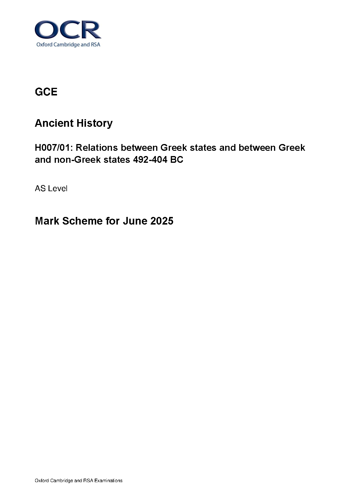 OCR AS ANCIENT HISTORY PAPER 1 2025 MARK SCHEME (H007/01: Relations between Greek states and between Greek and non-Greek states 492-404 BC). DOWNLOAD this verified paper on www.hackedexams.com and access the PDF INSTANTLY!!!