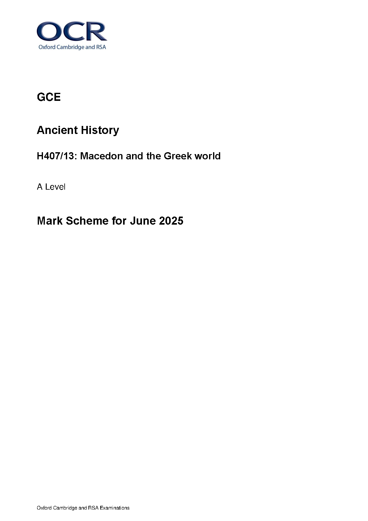OCR A LEVEL ANCIENT HISTORY PAPER 13 2025 MARK SCHEME (H407/13: Macedon and the Greek world). DOWNLOAD this verified paper on www.hackedexams.com and access the PDF INSTANTLY!!!