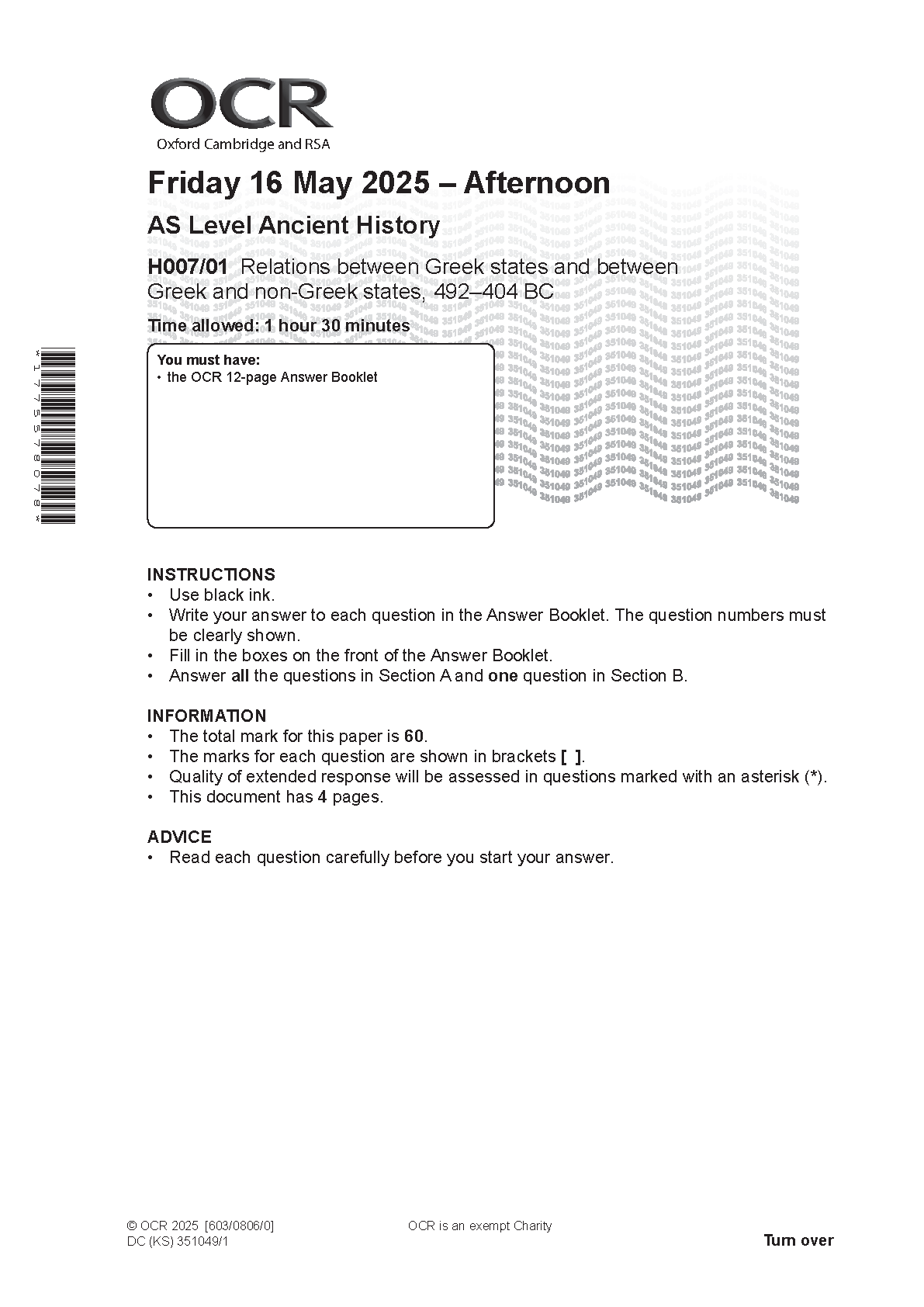 OCR AS ANCIENT HISTORY PAPER 1 2025 (H007/01: Relations between Greek states and between Greek and non‑Greek states, 492–404 BC). DOWNLOAD this verified paper on www.hackedexams.com and access the PDF INSTANTLY!!!