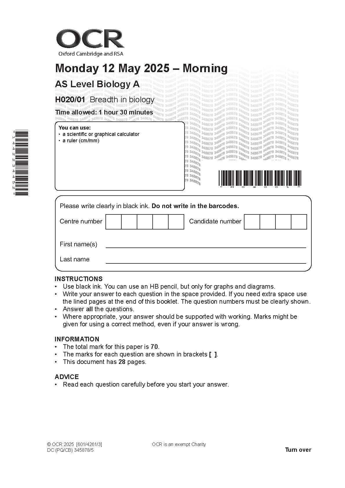 OCR AS BIOLOGY A PAPER 1 2025 (H020/01: Breadth in biology). DOWNLOAD this verified paper on www.hackedexams.com and access the PDF INSTANTLY!!!